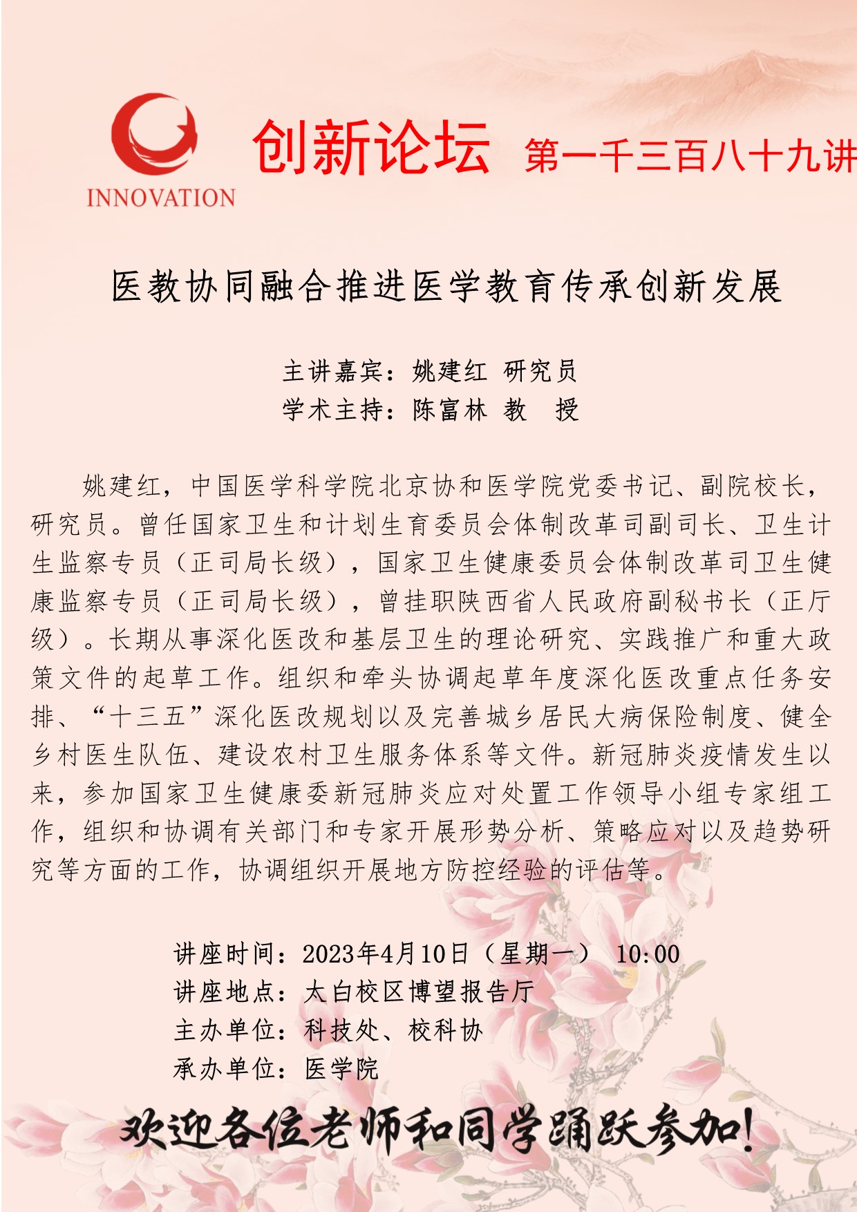 姚建红 研究员 MILAN.COM创新论坛第一千三百八十九讲:医教协同融合推进医学教育传承创新发展 讲座时间 2023年4月10日(星期一) 10:00 讲座地点 太白校区博望报告厅 讲座人介绍 姚建红 研究员 讲座内容