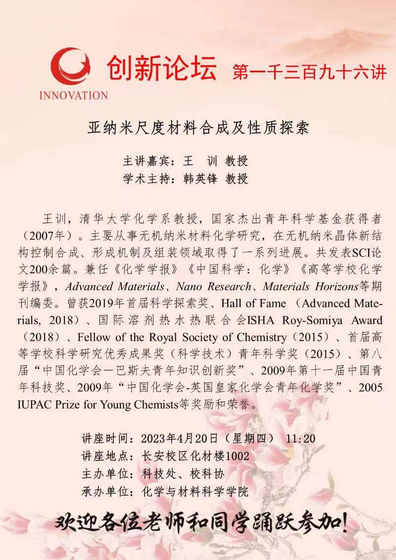 王 训 教授 MILAN.COM创新论坛第一千三百九十六讲:亚纳米尺度材料合成及性质探索 讲座时间 2023年4月20日(星期四) 11:20 讲座地点 长安校区化材楼1002 讲座人介绍 王 训 教授 讲座内容