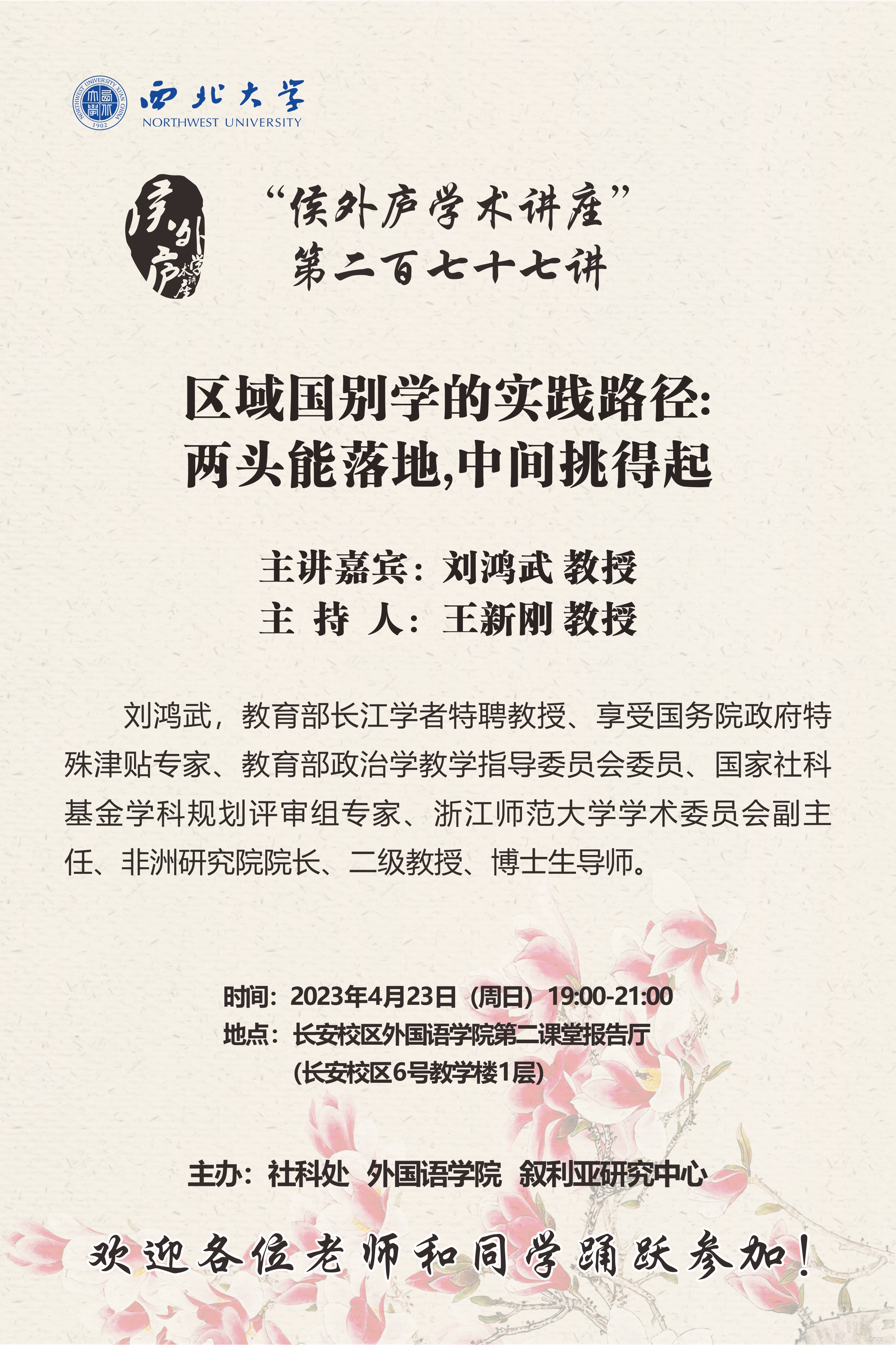 刘鸿武 教授 侯外庐学术讲座第二百七十七讲:区域国别学的实践路径:两头能落地,中间挑得起 讲座时间 2023年4月23日(周日)19:00 讲座地点 MILAN.COM外国语学院第二课堂报告厅 讲座人介绍 刘鸿武 教授 讲座内容