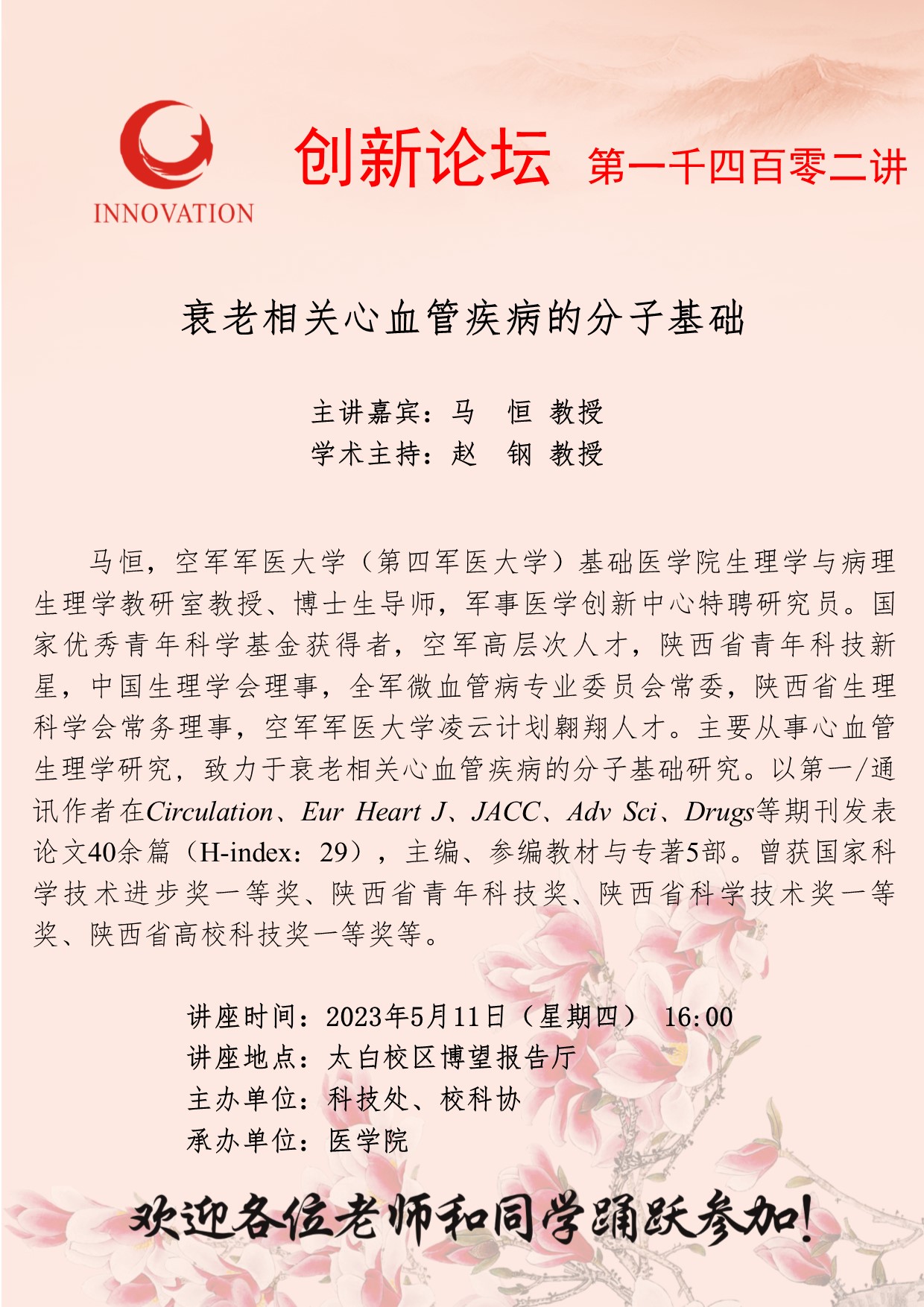 马恒 教授 MILAN.COM创新论坛第一千四百零二讲:衰老相关心血管疾病的分子基础 讲座时间 2023年5月11日(星期四) 16:00 讲座地点 太白校区博望报告厅 讲座人介绍 马恒 教授 讲座内容