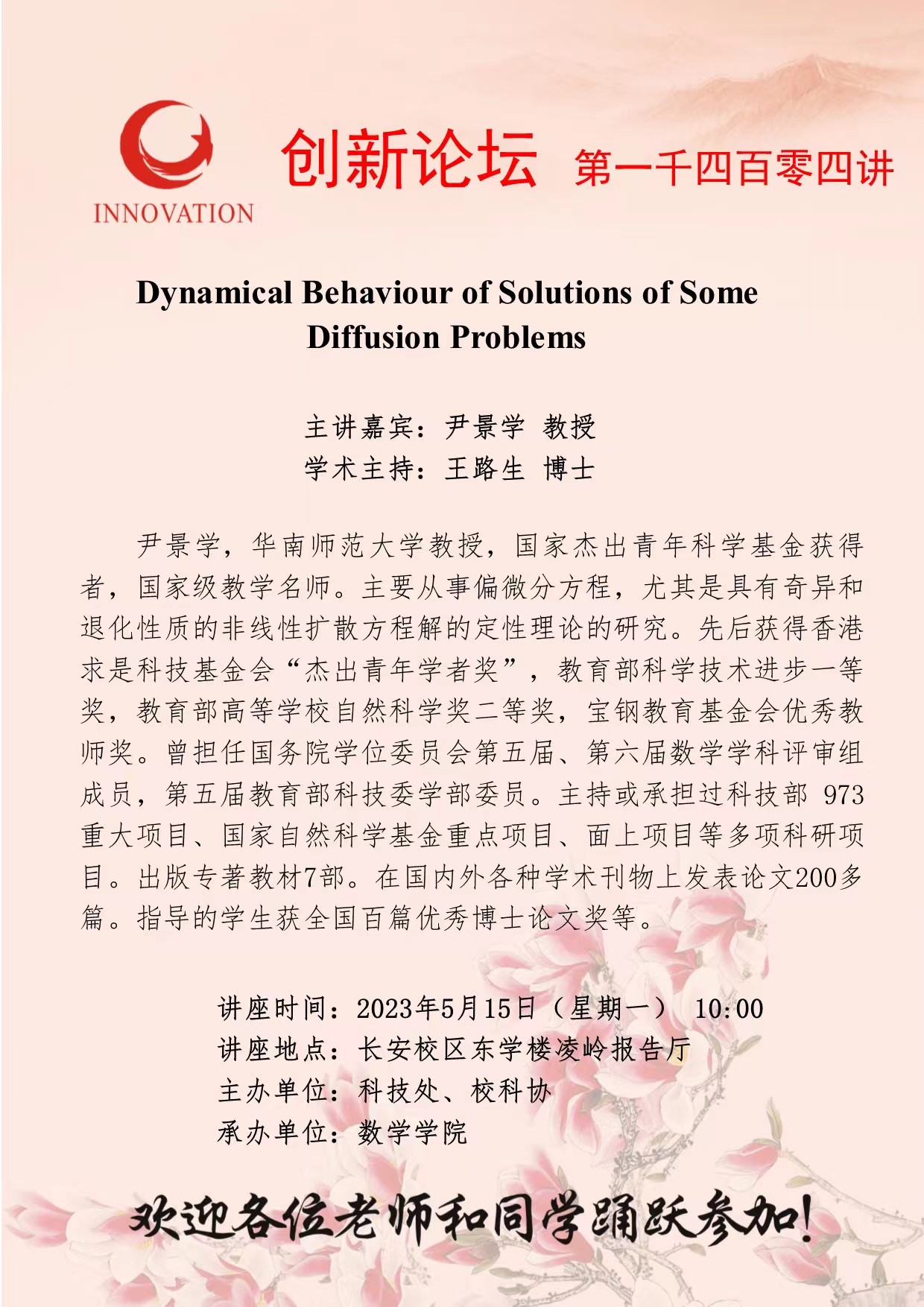 尹景学 教授 MILAN.COM创新论坛第一千四百零四讲:Dynamical Behaviour of Solutions of Some Diffusion Problems 讲座时间 2023年5月15日(星期一) 10:00 讲座地点 长安校区东学楼凌岭报告厅 讲座人介绍 尹景学 教授 讲座内容