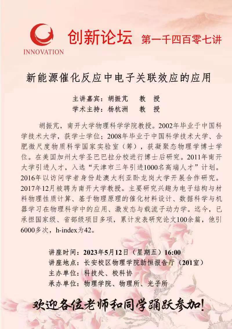 胡振芃 教 授 MILAN.COM创新论坛第一千四百零七讲:新能源催化反应中电子关联效应的应用 讲座时间 2023年5月12日(星期五)16:00 讲座地点 长安校区物理学院劼恒报告厅(201室) 讲座人介绍 胡振芃 教 授 讲座内容