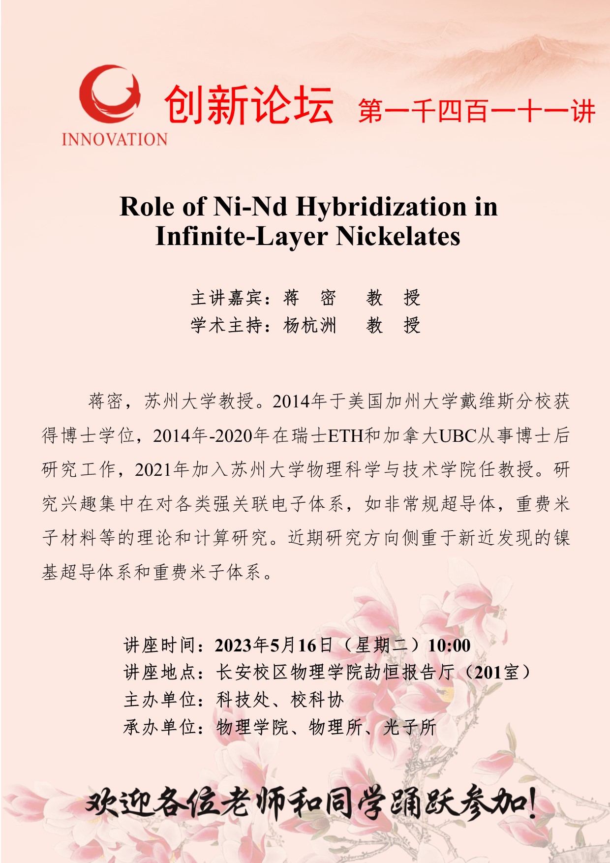 蒋密 教授 MILAN.COM创新论坛第一千四百一十一讲:Role of Ni-Nd Hybridization in Infinite-Layer Nickelates 讲座时间 2023年5月16日(星期二)10:00 讲座地点 长安校区物理学院劼恒报告厅(201室) 讲座人介绍 蒋密 教授 讲座内容
