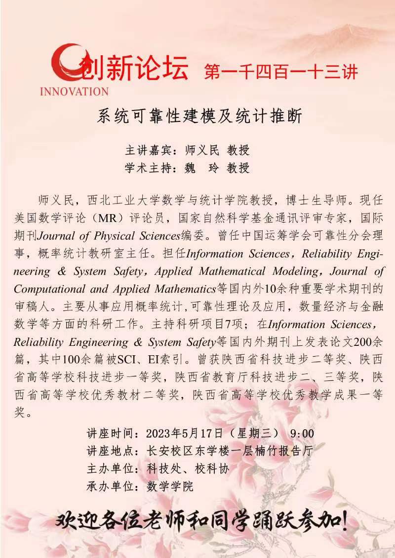 师义民 教授 MILAN.COM创新论坛第一千四百一十三讲:系统可靠性建模及统计推断 讲座时间 2023年5月17日(星期三) 9:00 讲座地点 长安校区东学楼一层楠竹报告厅 讲座人介绍 师义民 教授 讲座内容