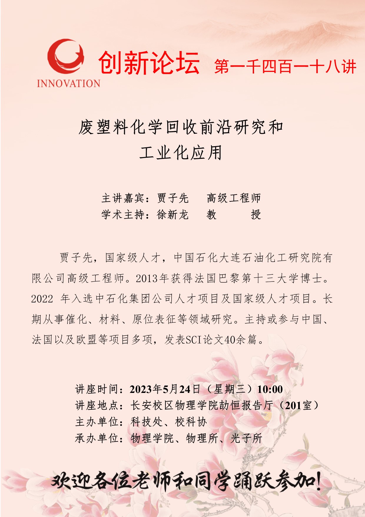 贾子先 高级工程师 MILAN.COM创新论坛第一千四百一十八讲:废塑料化学回收前沿研究和工业化应用 讲座时间 2023年5月24日(星期三)10:00 讲座地点 长安校区物理学院劼恒报告厅(201室) 讲座人介绍 贾子先 高级工程师 讲座内容