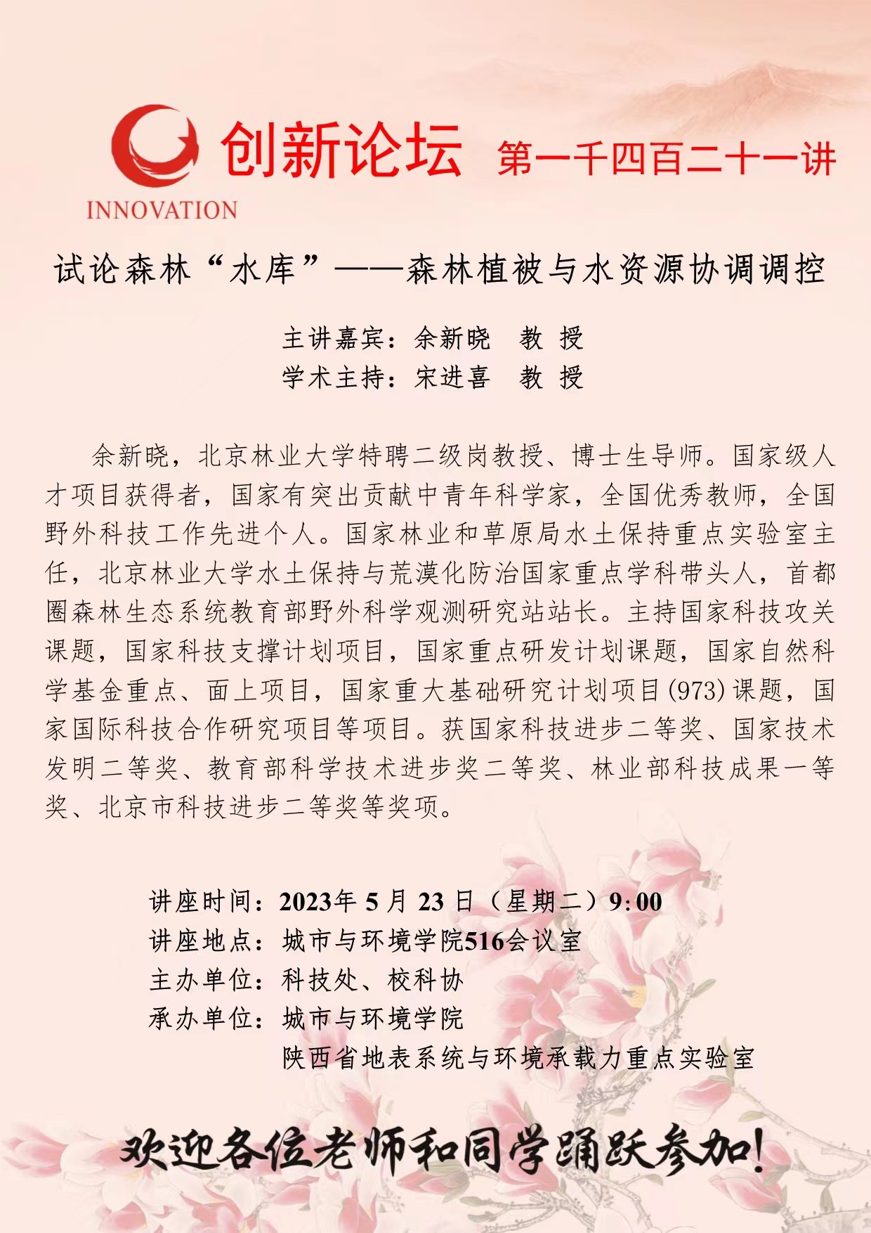 余新晓 教 授 MILAN.COM创新论坛第一千四百二十一讲:试论森林“水库”——森林植被与水资源协调调控 讲座时间 2023年5月23日(星期二)9:00 讲座地点 城市与环境学院516会议室 讲座人介绍 余新晓 教 授 讲座内容