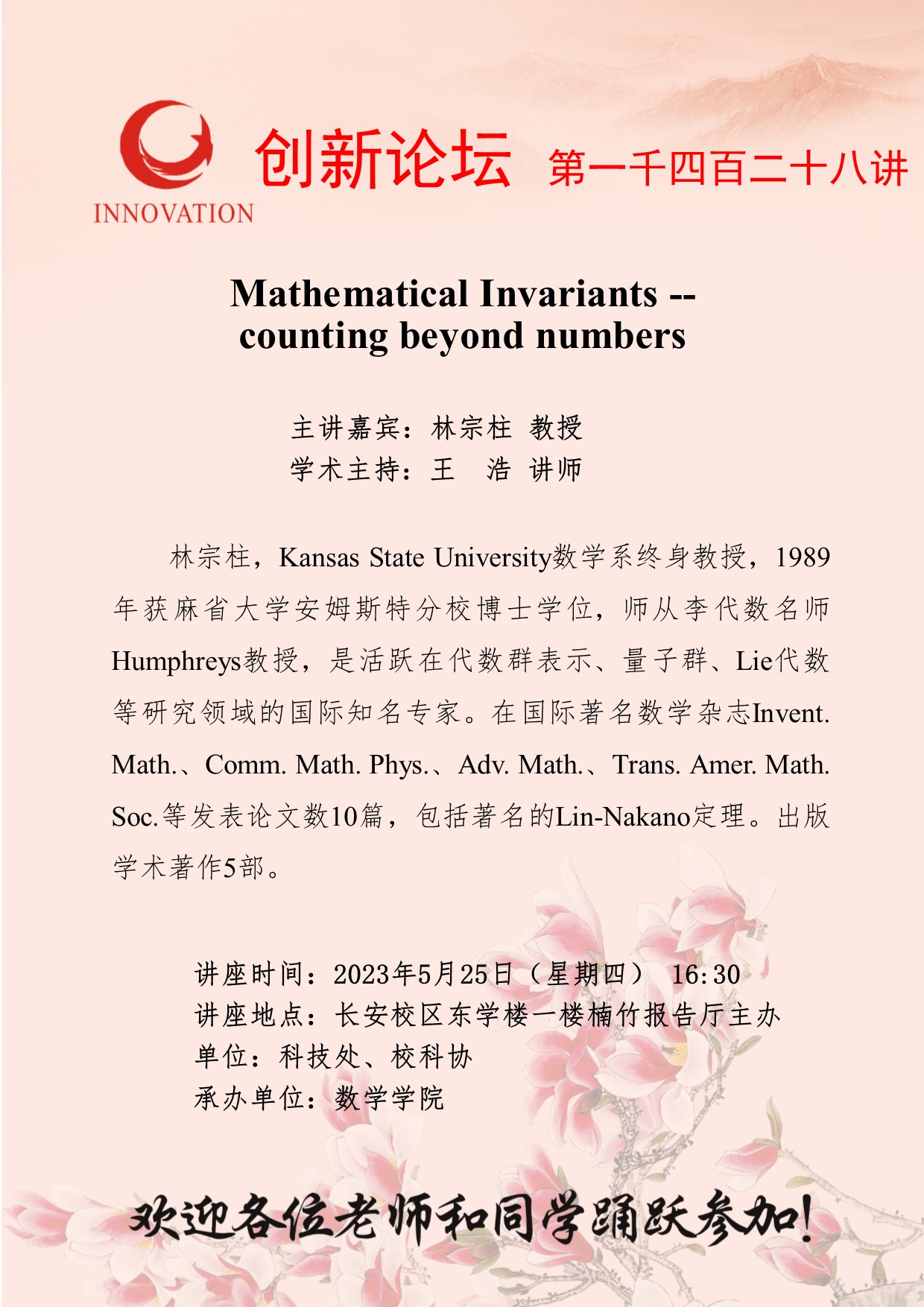 林宗柱 教授 MILAN.COM创新论坛第一千四百二十八讲:Mathematical Invariants --counting beyond numbers 讲座时间 2023年5月25日(星期四)16:30 讲座地点 长安校区东学楼一楼楠竹报告厅 讲座人介绍 林宗柱 教授 讲座内容