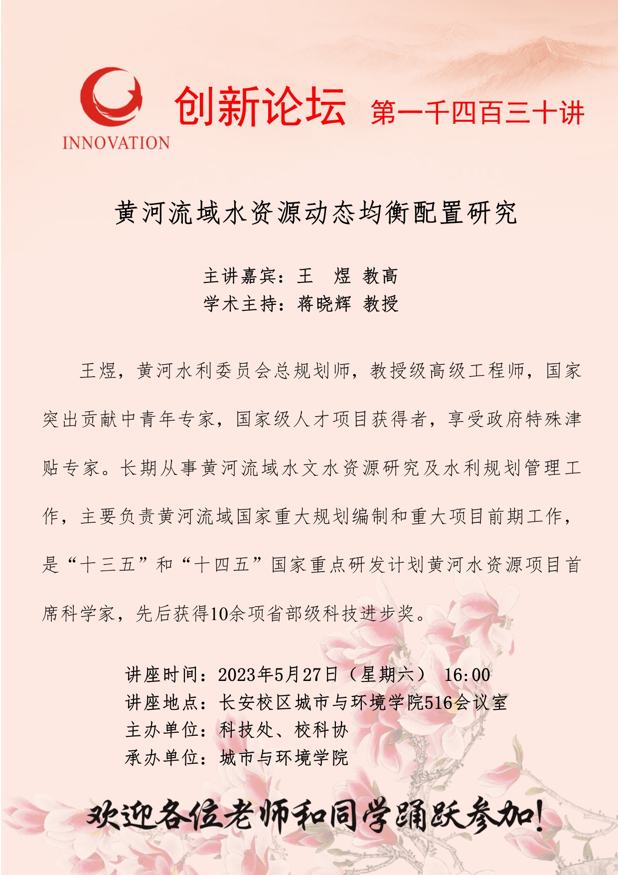 王 煜 教高 MILAN.COM创新论坛第一千四百三十讲:黄河流域水资源动态均衡配置研究 讲座时间 2023年5月27日(星期六) 16:00 讲座地点 长安校区城市与环境学院516会议室 讲座人介绍 王 煜 教高 讲座内容
