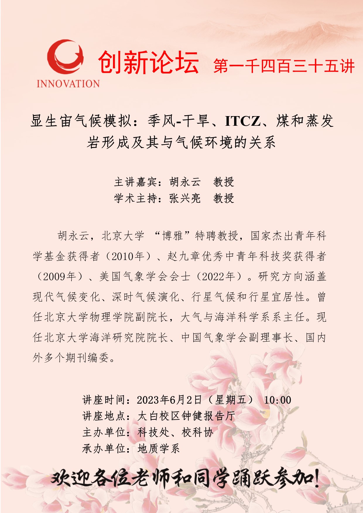 胡永云 教授 MILAN.COM创新论坛第一千四百三十五讲:显生宙气候模拟:季风-干旱、ITCZ、煤和蒸发岩形成及其与气候环境的关系 讲座时间 2023年6月2日(星期五) 10:00 讲座地点 太白校区钟健报告厅 讲座人介绍 胡永云 教授 讲座内容
