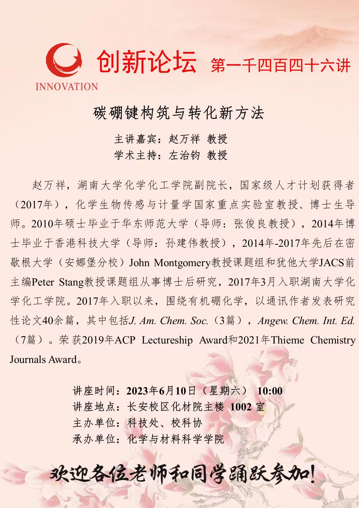 赵万祥 教授 MILAN.COM创新论坛第一千四百四十六讲:碳硼键构筑与转化新方法 讲座时间 2023年6月10日(星期六) 10:00 讲座地点 长安校区化材院主楼 1002 室 讲座人介绍 赵万祥 教授 讲座内容