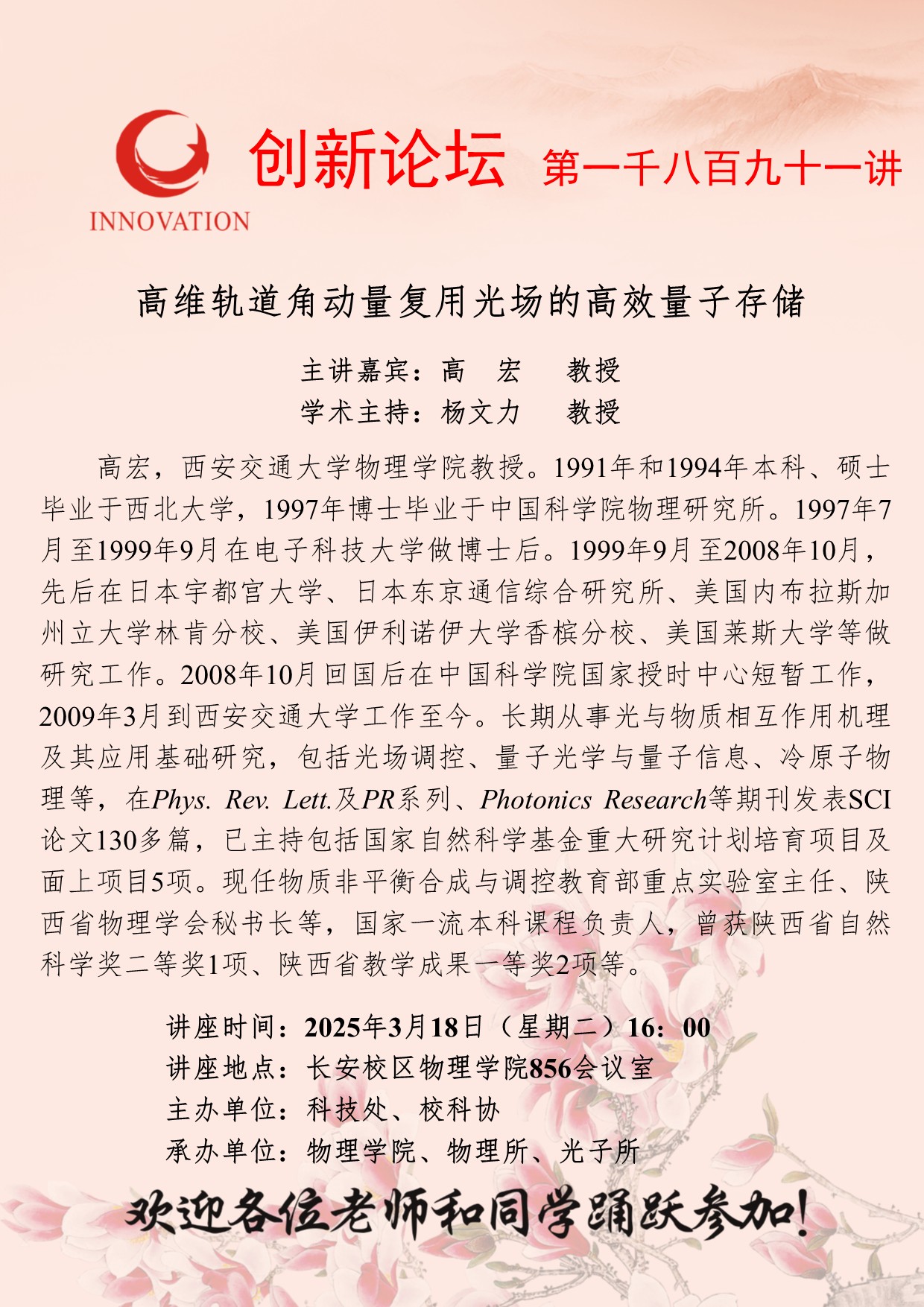 高宏 教授 MILAN.COM创新论坛第一千八百九十一讲:高维轨道角动量复用光场的高效量子存储 讲座时间 2025年3月18日(星期二)16:00 讲座地点 长安校区物理学院856会议室 讲座人介绍 高宏 教授 讲座内容