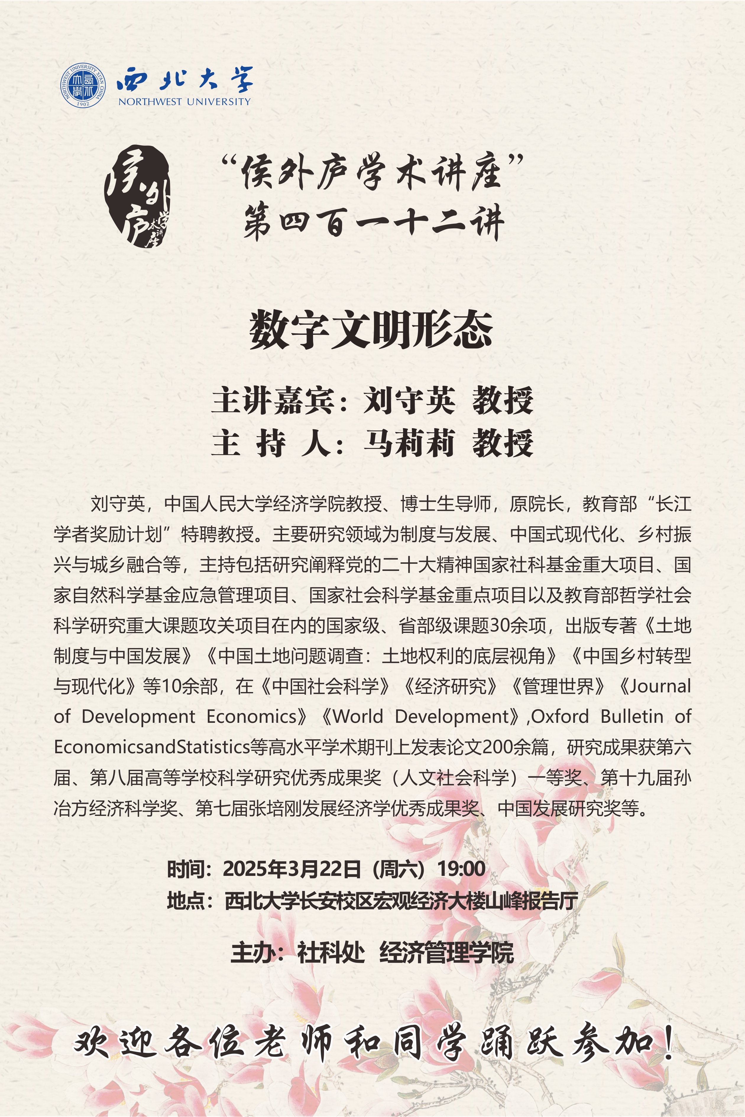 刘守英教授 “侯外庐学术讲座”第四百一十二讲:数字文明形态 讲座时间 2025年3月22日(周六)19:00 讲座地点 MILAN.COM长安校区宏观经济大楼山峰报告厅 讲座人介绍 刘守英教授 讲座内容
