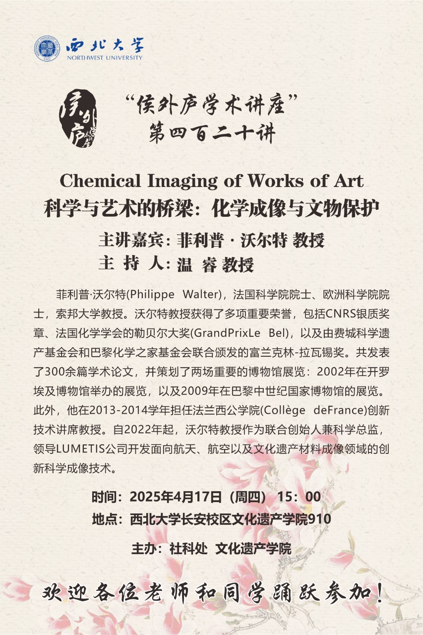 菲利普·沃尔特 教授 “侯外庐学术讲座”第四百二十讲:Chemical Imaging of Works of Art科学与艺术的桥梁:化学成像与文物保护 讲座时间 2025年4月17日(周四)15:00 讲座地点 MILAN.COM长安校区文化遗产学院910 讲座人介绍 菲利普·沃尔特 教授 讲座内容
