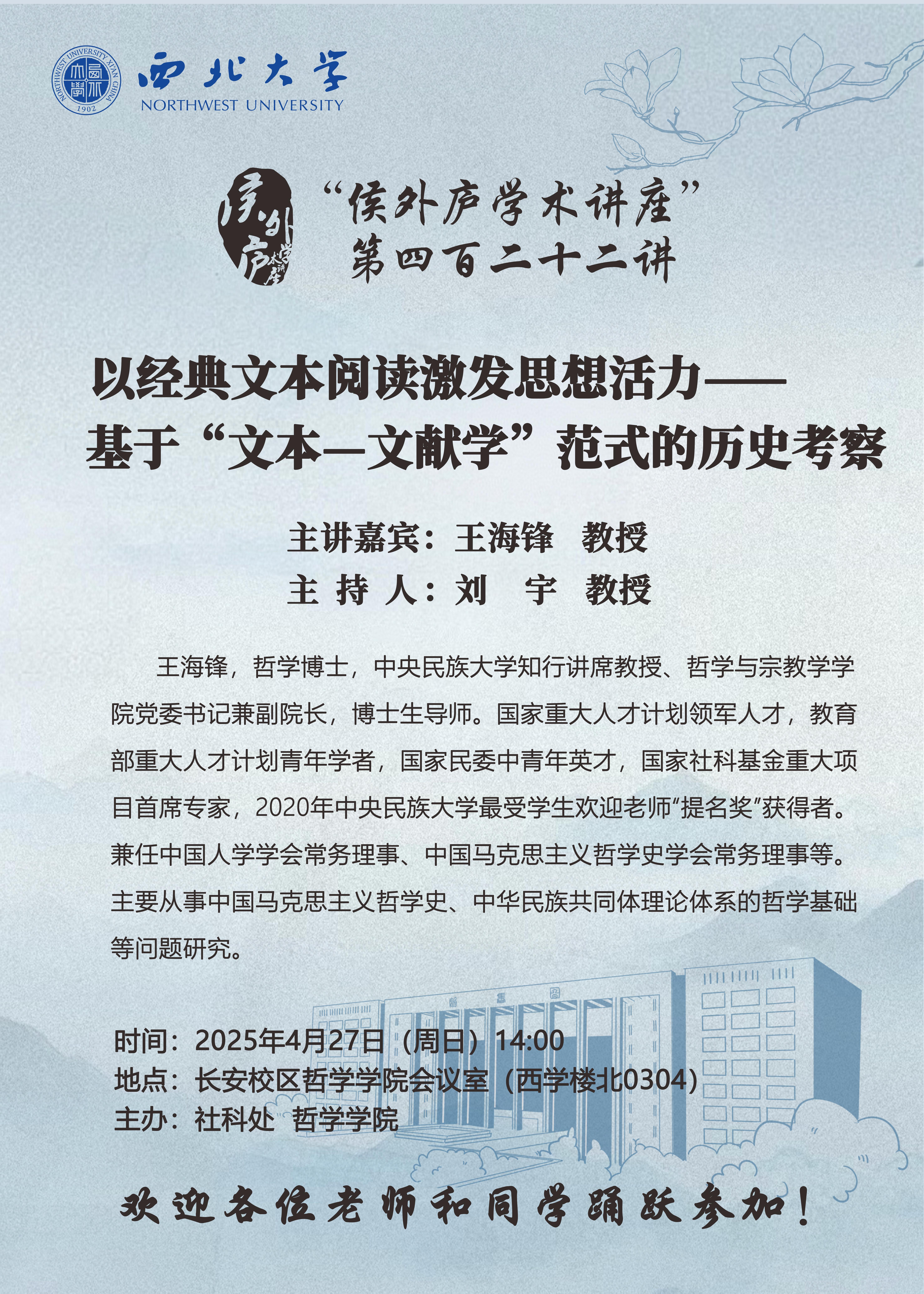 王海锋 教授 “侯外庐学术讲座”第四百二十二讲:以经典文本阅读激发思想活力--基于“文本一文献学”范式的历史考察 讲座时间 2025年4月27日(周日)14:00 讲座地点 哲学学院会议室((西学楼北0304) 讲座人介绍 王海锋 教授 讲座内容