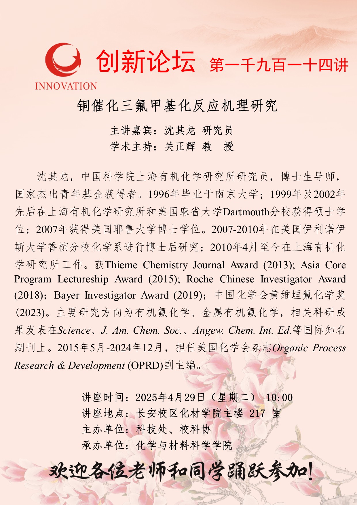 沈其龙 研究员 MILAN.COM创新论坛第一千九百一十四讲:铜催化三氟甲基化反应机理研究 讲座时间 2025年4月29日(星期二) 10:00 讲座地点 长安校区化材学院主楼 217 室 讲座人介绍 沈其龙 研究员 讲座内容