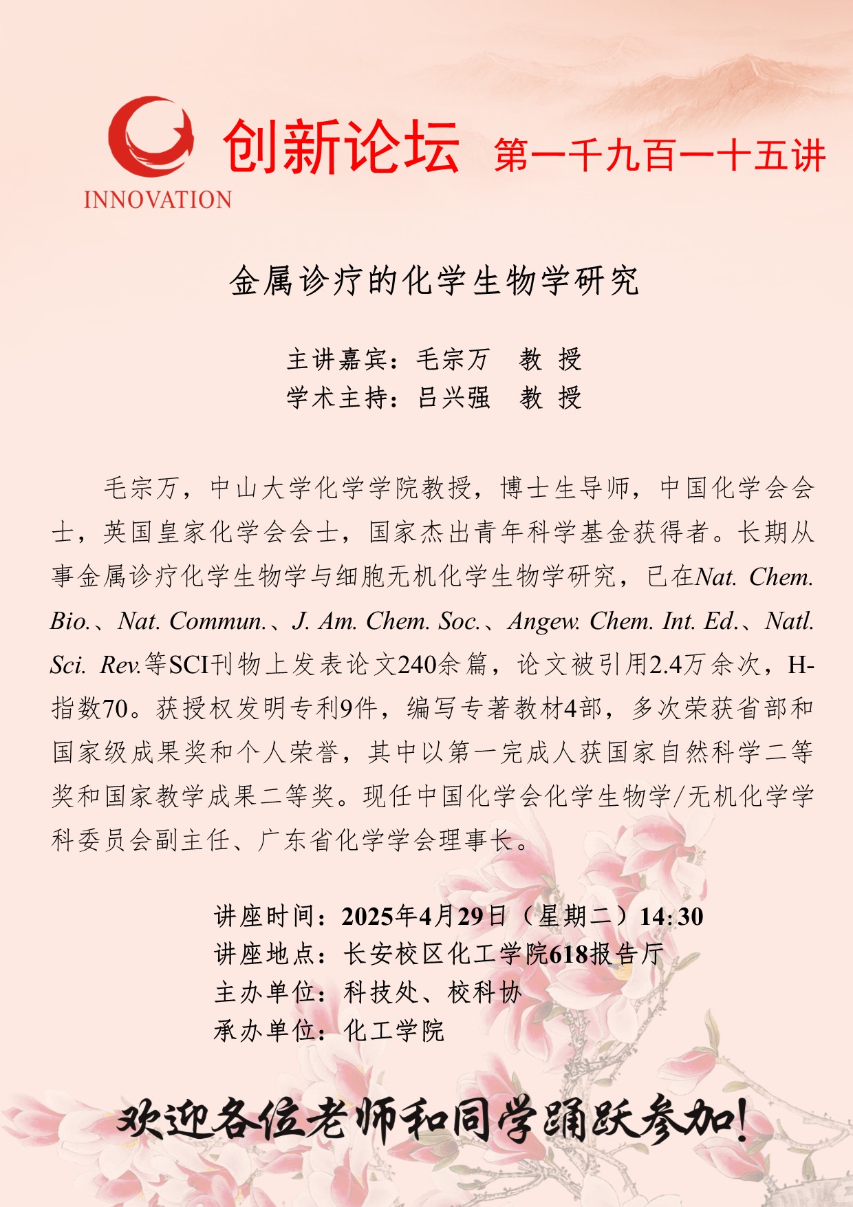 毛宗万 教授 MILAN.COM创新论坛第一千九百一十五讲:金属诊疗的化学生物学研究 讲座时间 2025年4月29日(星期二)14:30 讲座地点 长安校区化工学院618报告厅 讲座人介绍 毛宗万 教授 讲座内容