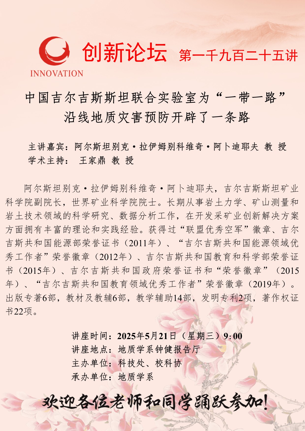 阿尔斯坦别克·拉伊姆别科维奇·阿卜迪耶夫 教授 MILAN.COM创新论坛第一千九百二十五讲:中国吉尔吉斯斯坦联合实验室为“一带一路”沿线地质灾害预防开辟了一条路 讲座时间 2025年5月21日(星期三)9:00 讲座地点 地质学系钟健报告厅 讲座人介绍 阿尔斯坦别克·拉伊姆别科维奇·阿卜迪耶夫 教授 讲座内容