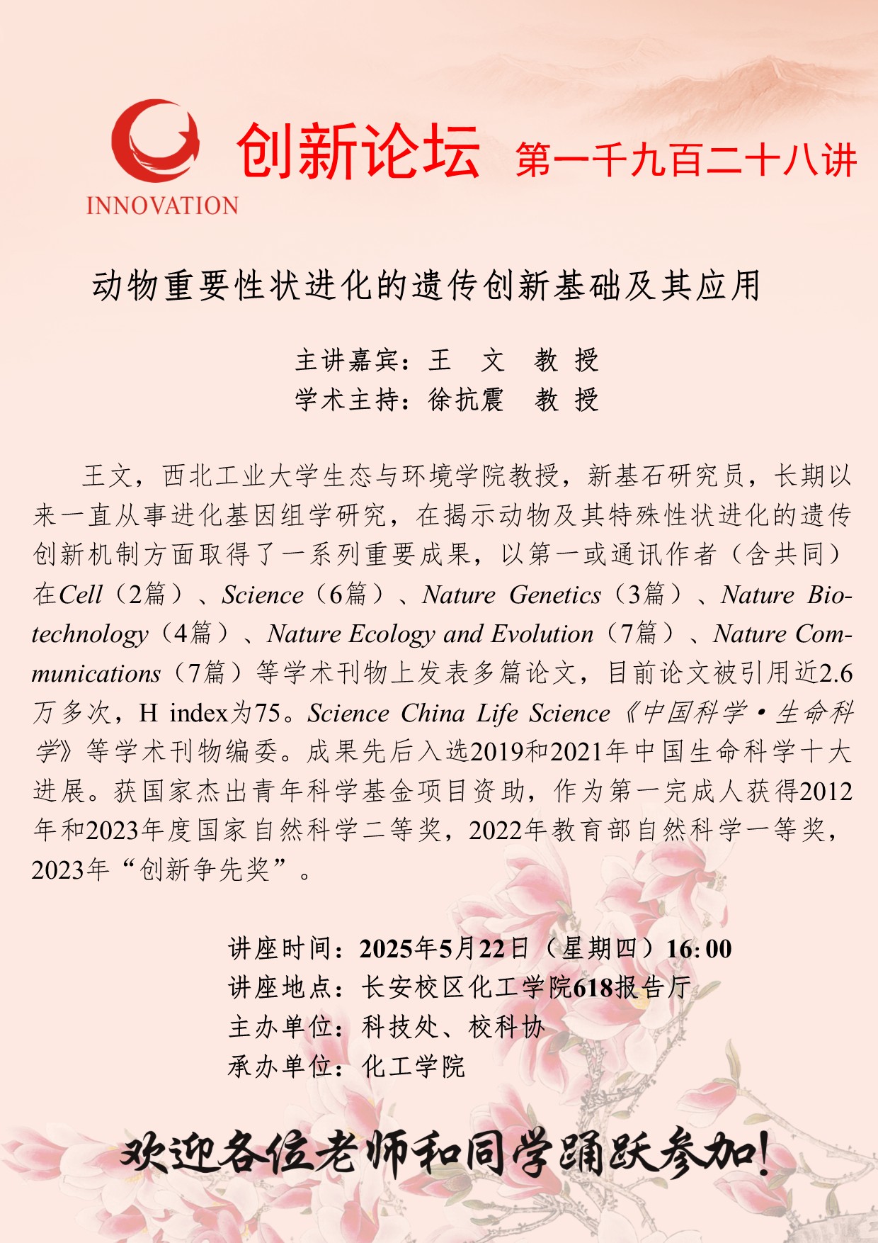 王文 教授 MILAN.COM创新论坛第一千九百二十八讲:动物重要性状进化的遗传创新基础及其应用 讲座时间 2025年5月22日(星期四)16:00 讲座地点 长安校区化工学院618报告厅 讲座人介绍 王文 教授 讲座内容