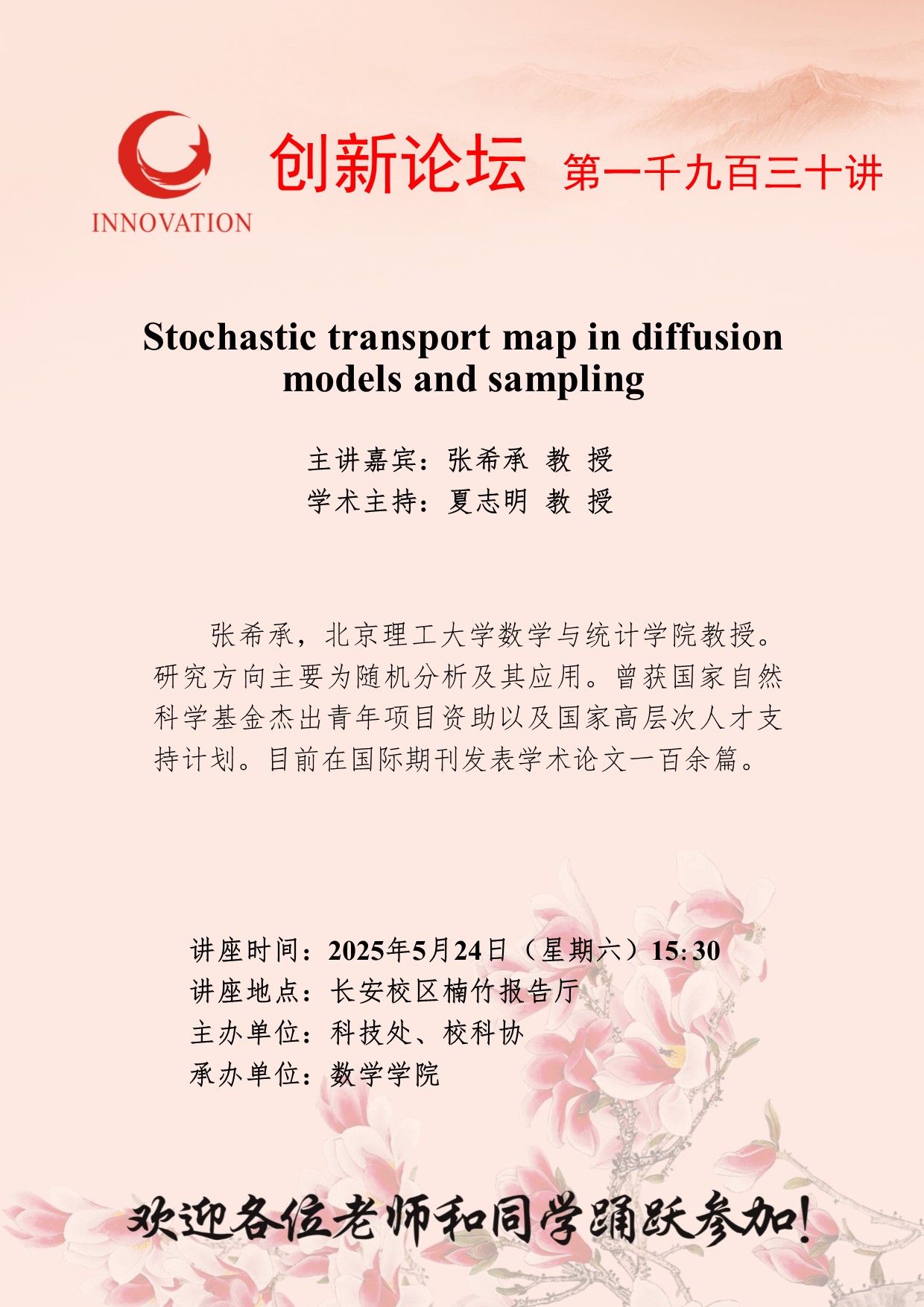 张希承 教授 MILAN.COM创新论坛第一千九百三十讲:Stochastic transport map in diffusion models and sampling 讲座时间 2025年5月24日(星期六)15:30 讲座地点 长安校区楠竹报告厅 讲座人介绍 张希承 教授 讲座内容