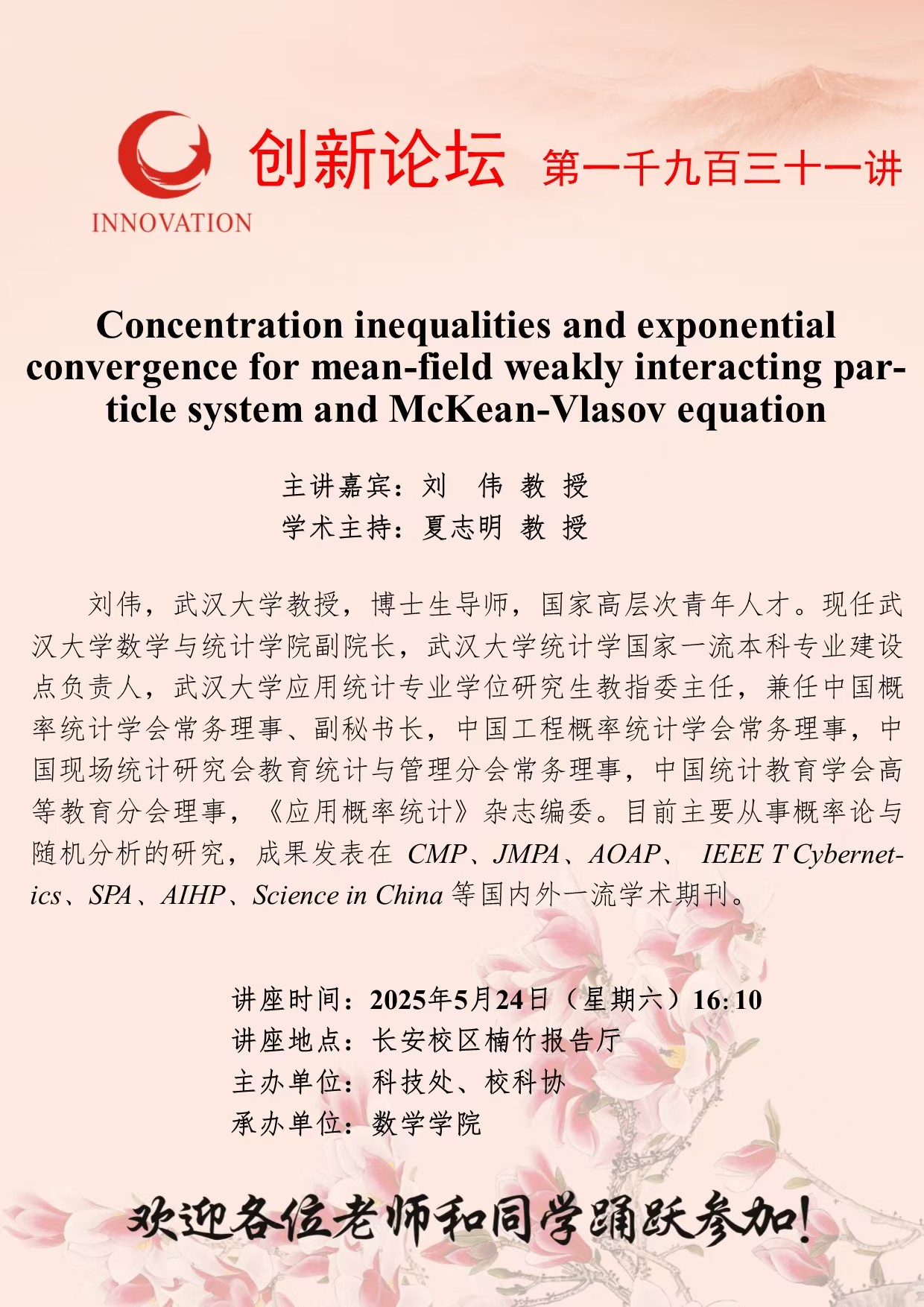 刘伟 教授 MILAN.COM创新论坛第一千九百三十一讲:Concentration inequalities and exponential convergence for mean-field weakly interacting particle system and McKean-Vlasov equation 讲座时间 2025年5月24日(星期六)16:10 讲座地点 长安校区楠竹报告厅 讲座人介绍 刘伟 教授 讲座内容