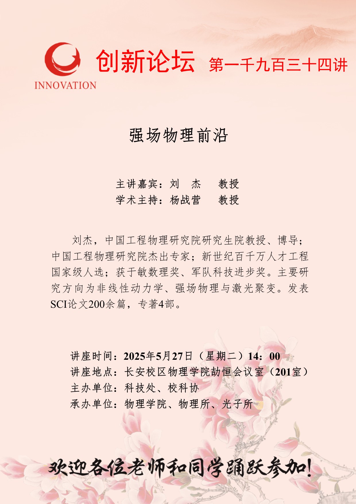 刘杰 教授 MILAN.COM创新论坛第一千九百三十四讲:强场物理前沿 讲座时间 2025年5月27日(星期二)14:00 讲座地点 长安校区物理学院劼恒会议室(201室) 讲座人介绍 刘杰 教授 讲座内容