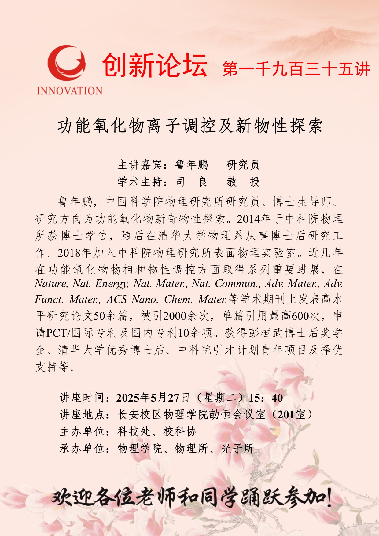 鲁年鹏 研究员 MILAN.COM创新论坛第一千九百三十五讲:功能氧化物离子调控及新物性探索 讲座时间 2025年5月27日(星期二)15:40 讲座地点 长安校区物理学院劼恒会议室(201室) 讲座人介绍 鲁年鹏 研究员 讲座内容