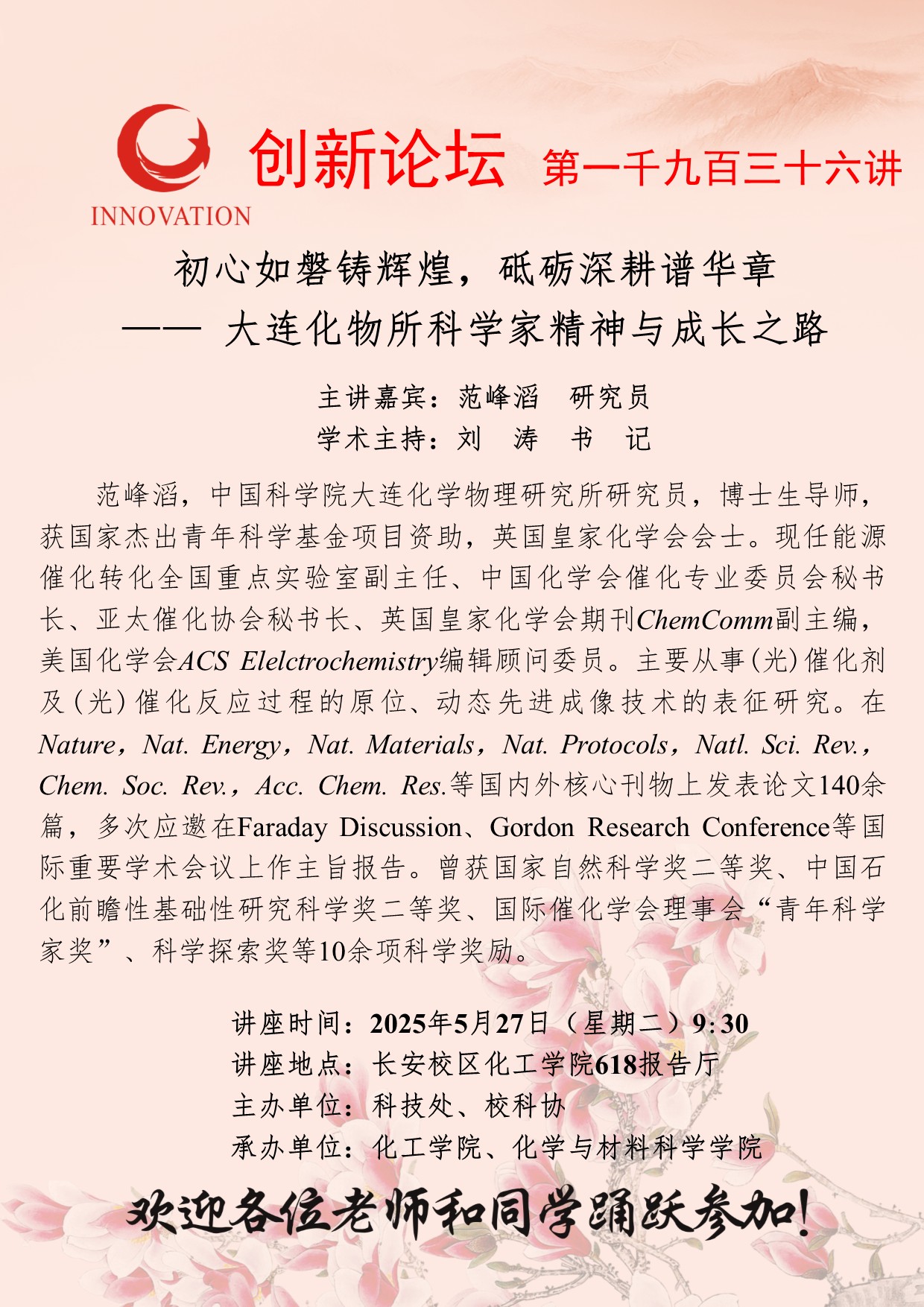 范峰滔 研究员 MILAN.COM创新论坛第一千九百三十六讲:初心如磐铸辉煌,砥砺深耕谱华章——大连化物所科学家精神与成长之路 讲座时间 2025年5月27日(星期二)9:30 讲座地点 长安校区化工学院618报告厅 讲座人介绍 范峰滔 研究员 讲座内容