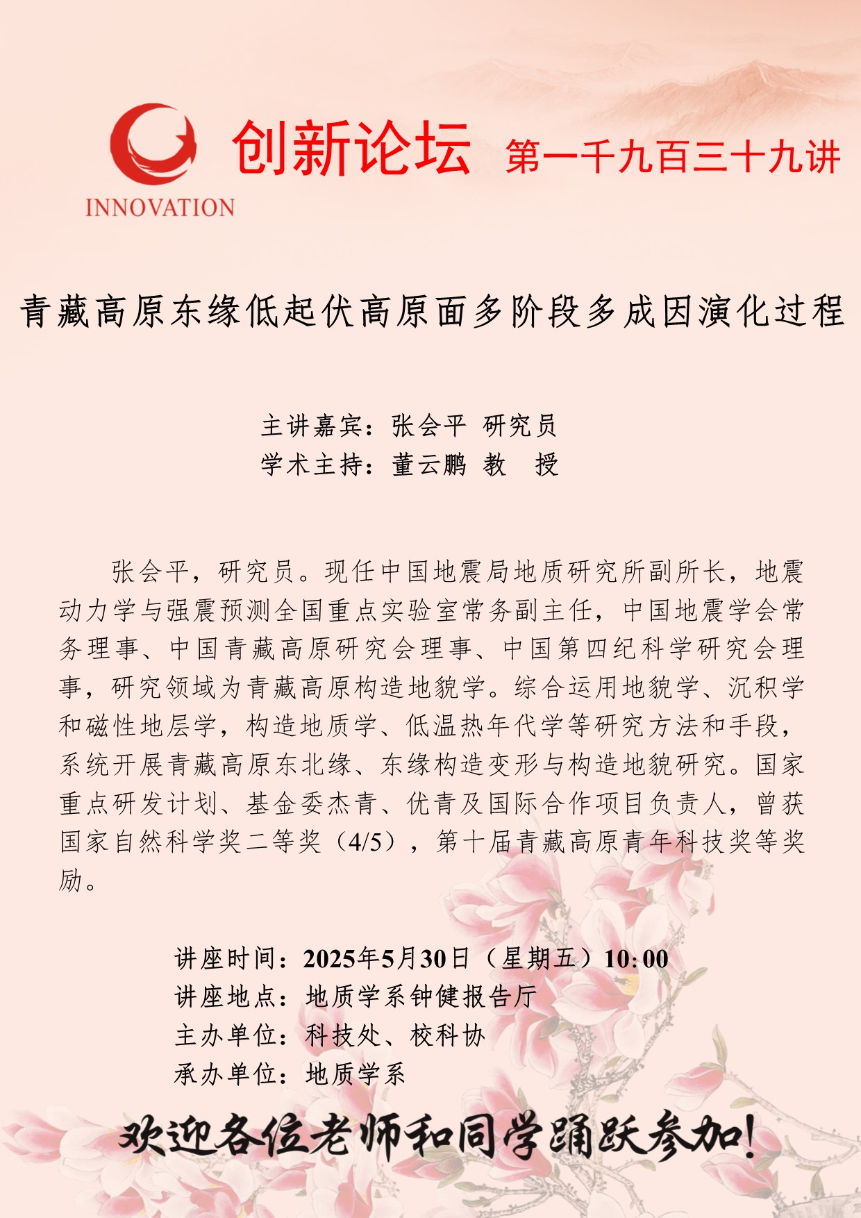 张会平 研究员 MILAN.COM创新论坛第一千九百三十九讲:青藏高原东缘低起伏高原面多阶段多成因演化过程 讲座时间 2025年5月30日(星期五)10:00 讲座地点 地质学系钟健报告厅 讲座人介绍 张会平 研究员 讲座内容