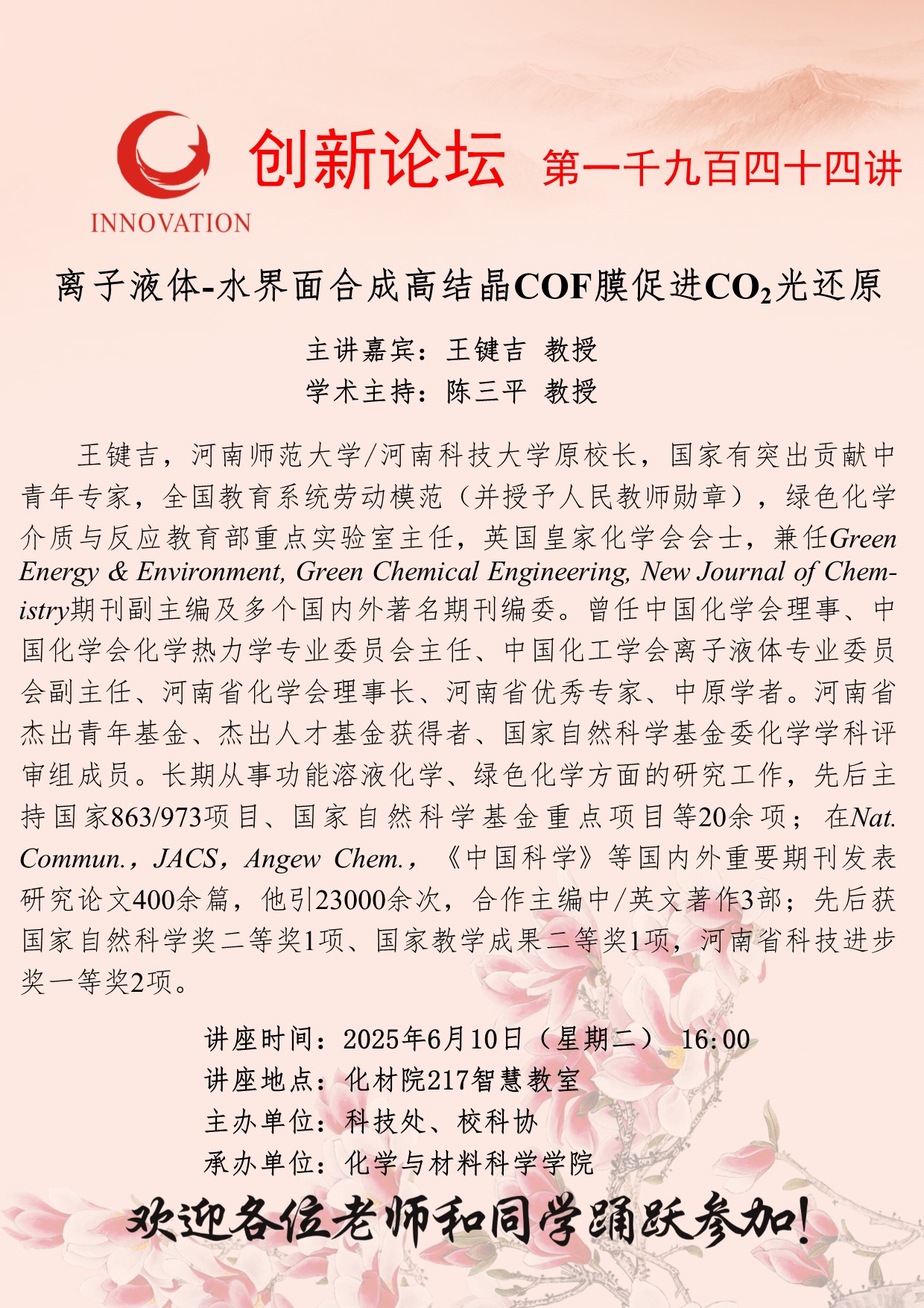 王键吉 教授 MILAN.COM创新论坛第一千九百四十四讲:离子液体-水界面合成高结晶COF膜促进CO2光还原 讲座时间 2025年6月10日(星期二) 16:00 讲座地点 化材院217智慧教室 讲座人介绍 王键吉 教授 讲座内容