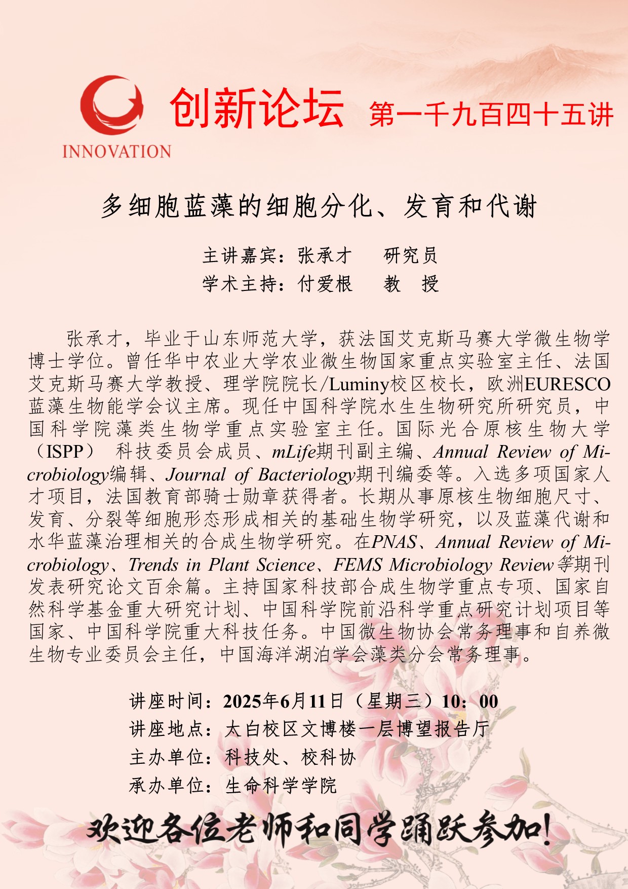 张承才 研究员 MILAN.COM创新论坛第一千九百四十五讲:多细胞蓝藻的细胞分化、发育和代谢 讲座时间 2025年6月11日(星期三)10:00 讲座地点 太白校区文博楼一层博望报告厅 讲座人介绍 张承才 研究员 讲座内容