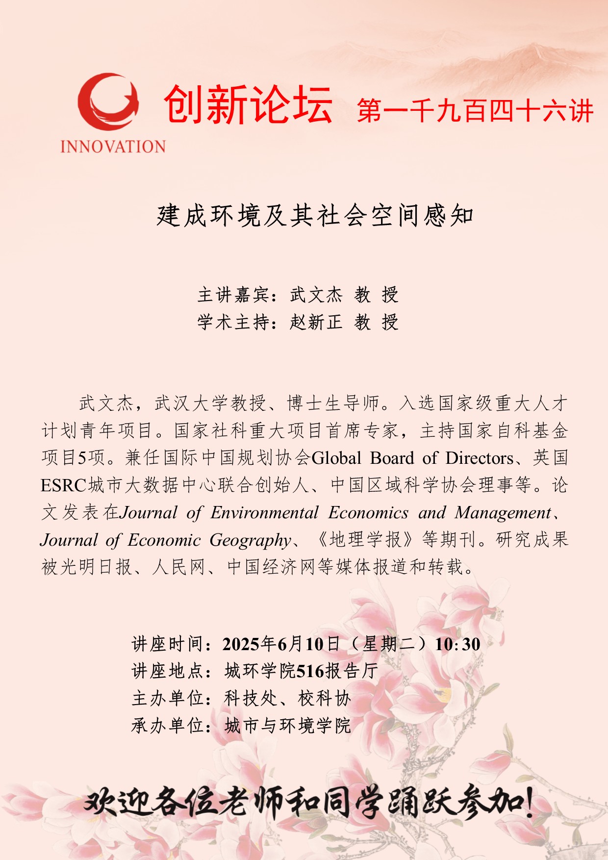 武文杰 教授 MILAN.COM创新论坛第一千九百四十六讲:建成环境及其社会空间感知 讲座时间 2025年6月10日(星期二)10:30 讲座地点 城环学院516报告厅 讲座人介绍 武文杰 教授 讲座内容