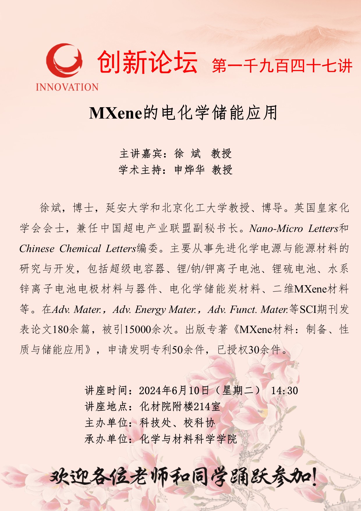 徐斌 教授 MILAN.COM创新论坛第一千九百四十七讲:MXene的电化学储能应用 讲座时间 2024年6月10日(星期二) 14:30 讲座地点 化材院附楼214室 讲座人介绍 徐斌 教授 讲座内容