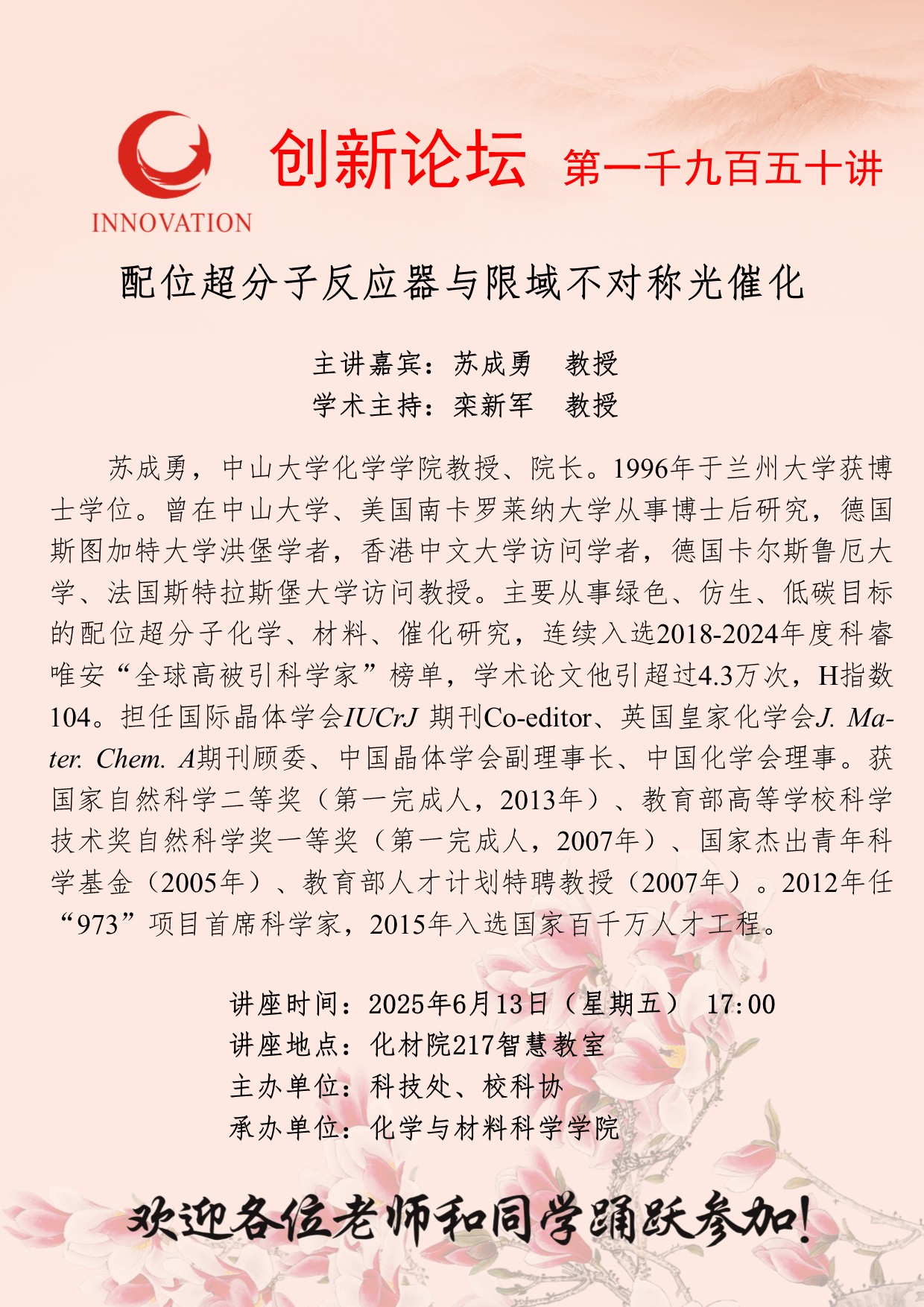 苏成勇 教授 MILAN.COM创新论坛第一千九百五十讲:配位超分子反应器与限域不对称光催化 讲座时间 2025年6月13日(星期五) 17:00 讲座地点 化材院217智慧教室 讲座人介绍 苏成勇 教授 讲座内容