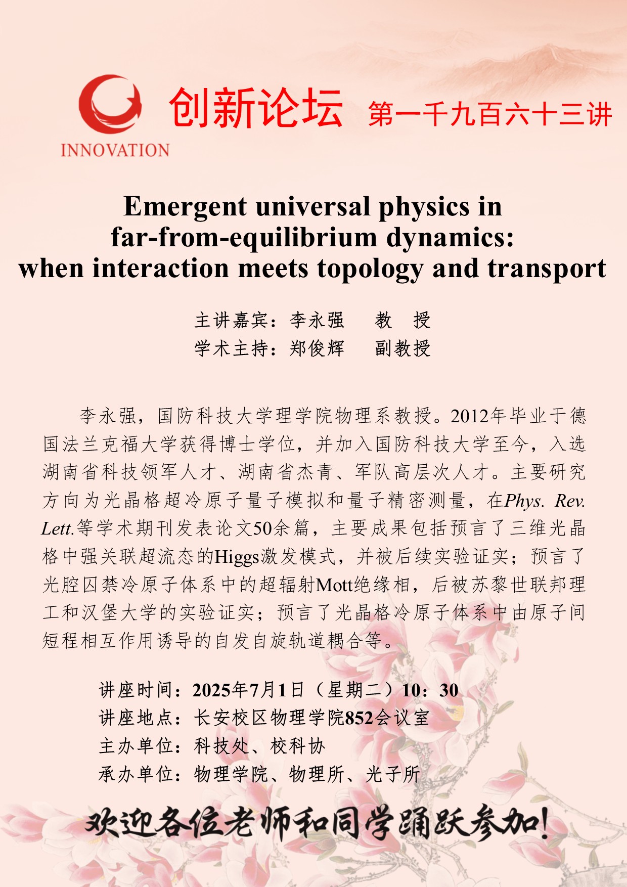 李永强 教授 MILAN.COM创新论坛第一千九百六十三讲:Emergent universal physics in far-from-equilibrium dynamics: when interaction meets topology and transport 讲座时间 2025年7月1日(星期二)10:30 讲座地点 长安校区物理学院852会议室 讲座人介绍 李永强 教授 讲座内容