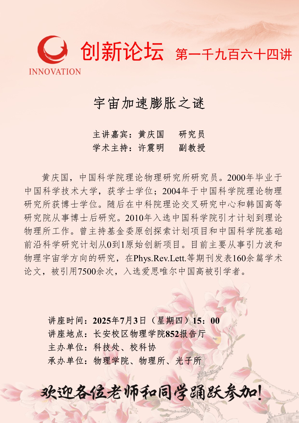 黄庆国 研究员 MILAN.COM创新论坛第一千九百六十四讲:宇宙加速膨胀之谜 讲座时间 2025年7月3日(星期四)15:00 讲座地点 长安校区物理学院852报告厅 讲座人介绍 黄庆国 研究员 讲座内容