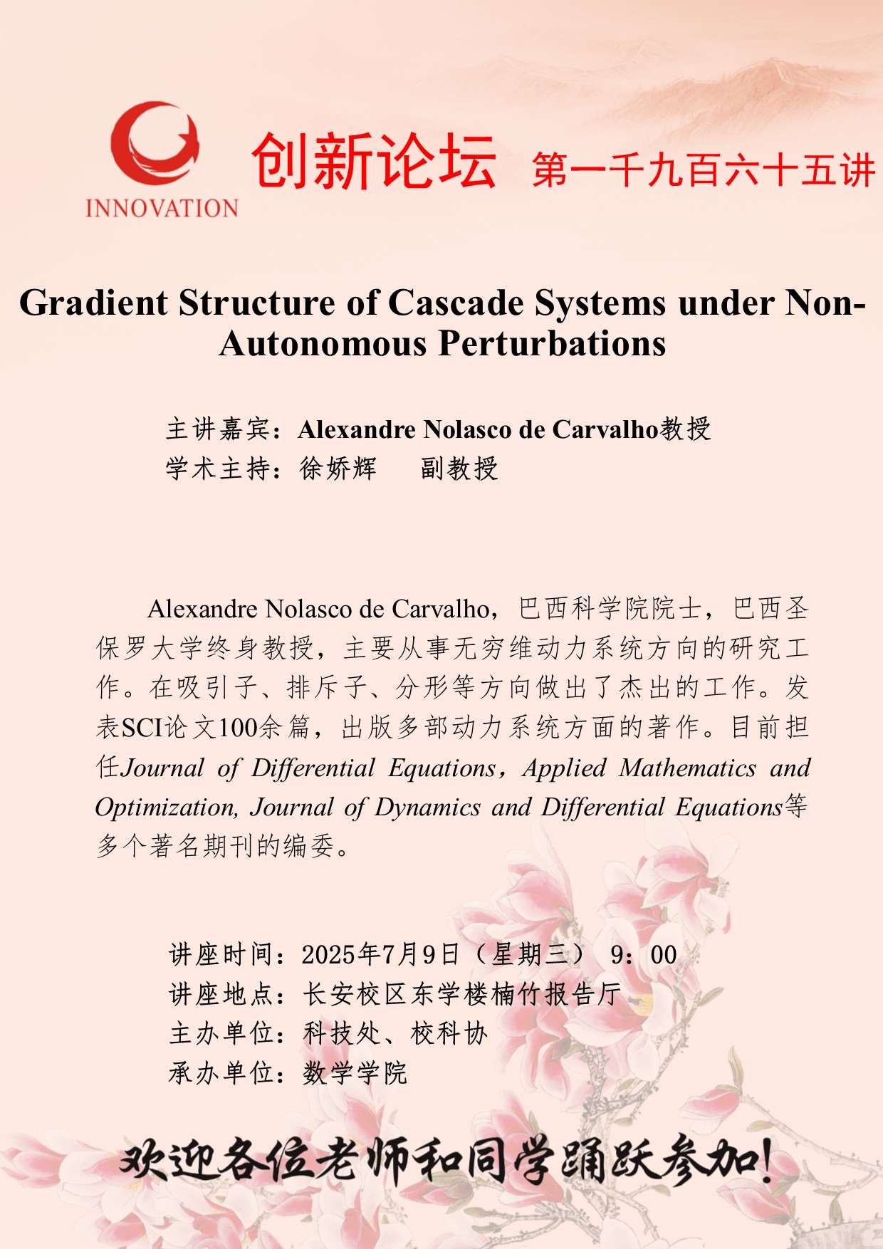 Alexandre Nolasco de Carvalho 教授 MILAN.COM创新论坛第一千九百六十五讲:Gradient Structure of Cascade Systems under Non-Autonomous Perturbations 讲座时间 2025年7月9日(星期三) 9:00 讲座地点 长安校区东学楼楠竹报告厅 讲座人介绍 Alexandre Nolasco de Carvalho 教授 讲座内容