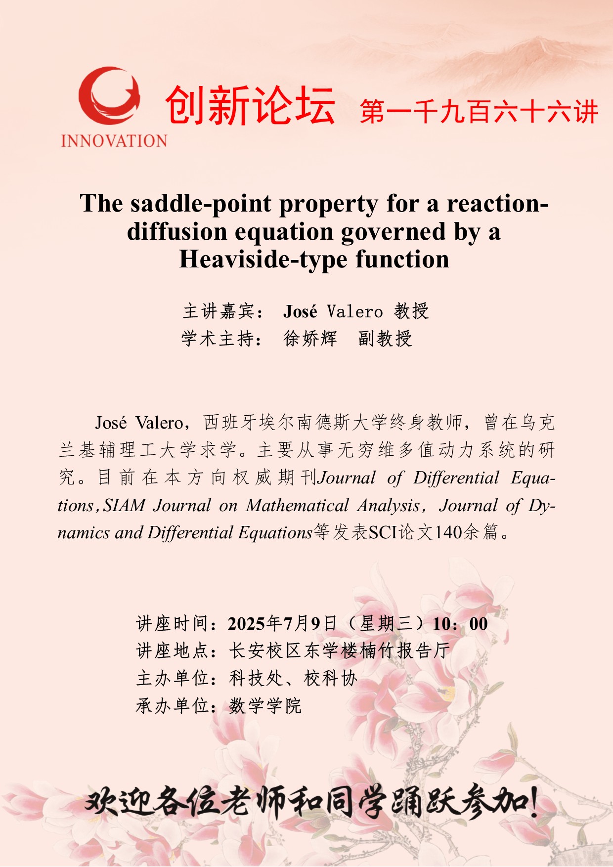 José Valero 教授 MILAN.COM创新论坛第一千九百六十六讲:The saddle-point property for a reaction-diffusion equation governed by a Heaviside-type function 讲座时间 2025年7月9日(星期三)10:00 讲座地点 长安校区东学楼楠竹报告厅 讲座人介绍 José Valero 教授 讲座内容