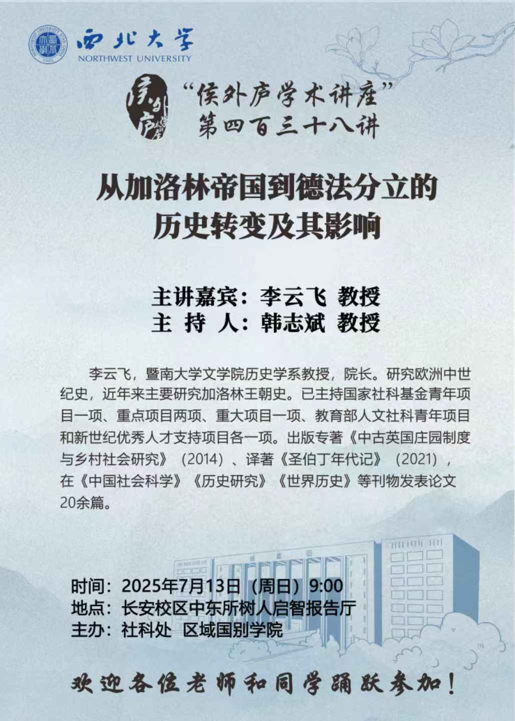 李云飞 教授 “侯外庐学术讲座”第四百三十八讲:从加洛林帝国到德法分立的历史转变及其影响 讲座时间 2025年7月13日(周日)9:00 讲座地点 长安校区中东所树人启智报告厅 讲座人介绍 李云飞 教授 讲座内容