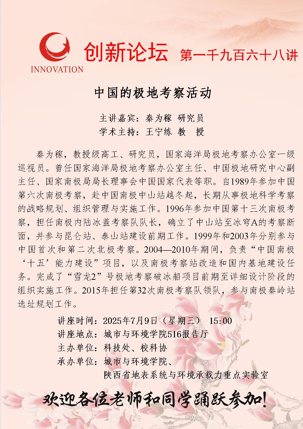秦为稼 研究员 MILAN.COM创新论坛第一千九百六十八讲:中国的极地考察活动 讲座时间 2025年7月9日(星期三) 15:00 讲座地点 城市与环境学院516报告厅 讲座人介绍 秦为稼 研究员 讲座内容