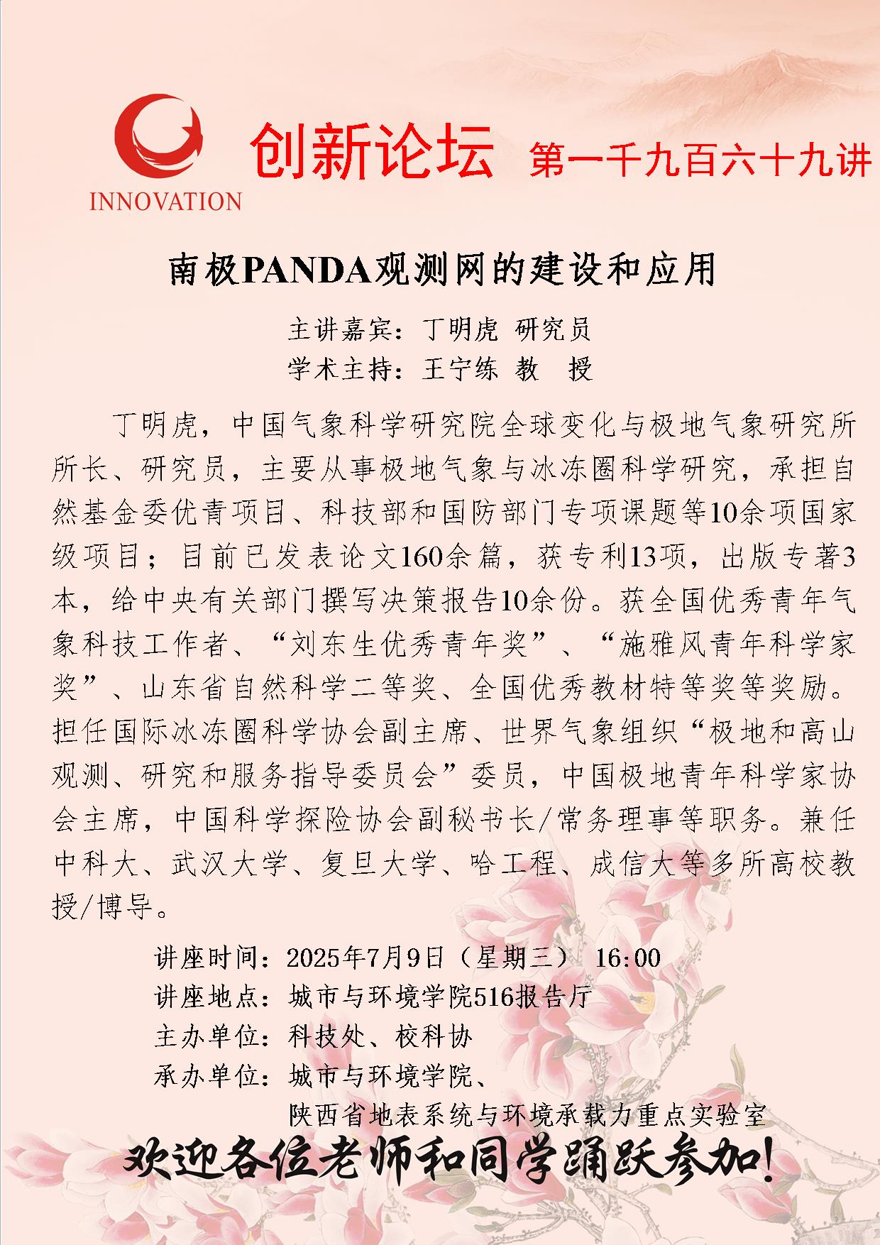 丁明虎 研究员 MILAN.COM创新论坛第一千九百六十九讲:南极PANDA观测网的建设和应用 讲座时间 2025年7月9日(星期三) 16:00 讲座地点 城市与环境学院516报告厅 讲座人介绍 丁明虎 研究员 讲座内容