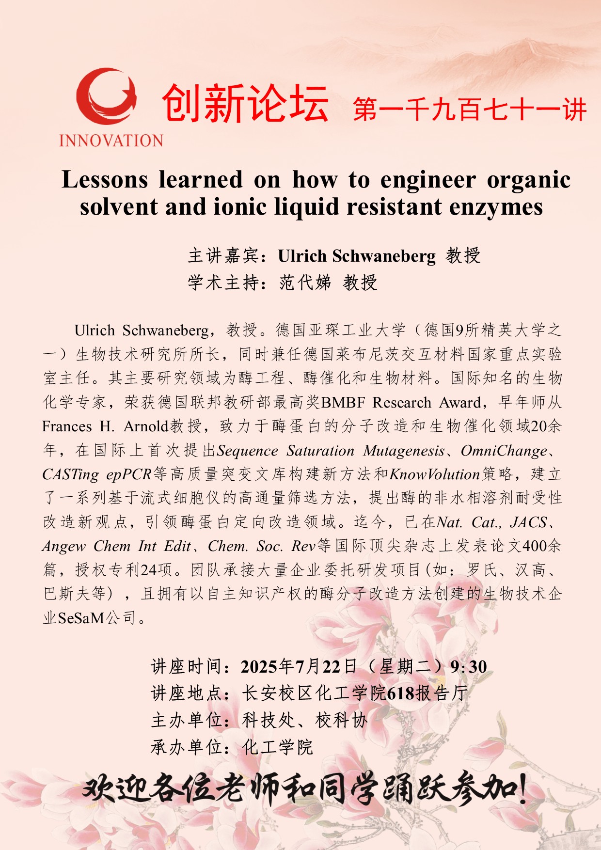 Ulrich Schwaneberg 教授 MILAN.COM创新论坛第一千九百七十一讲:Lessons learned on how to engineer organic solvent and ionic liquid resistant enzymes 讲座时间 2025年7月22日(星期二)9:30 讲座地点 长安校区化工学院618报告厅 讲座人介绍 Ulrich Schwaneberg 教授 讲座内容