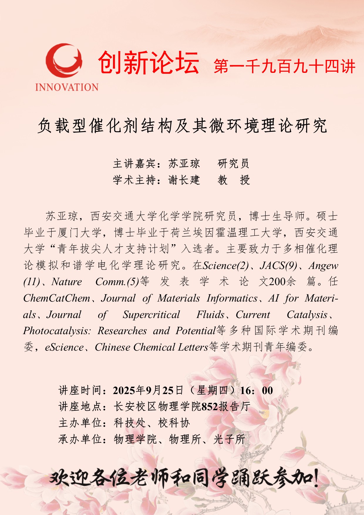 苏亚琼 研究员 MILAN.COM创新论坛第一千九百九十四讲:负载型催化剂结构及其微环境理论研究 讲座时间 2025年9月25日(星期四)16:00 讲座地点 长安校区物理学院852报告厅 讲座人介绍 苏亚琼 研究员 讲座内容