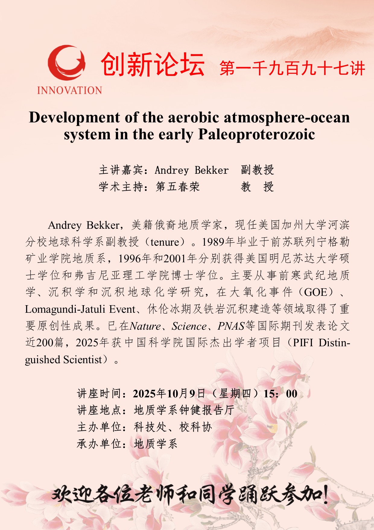 Andrey Bekker 副教授 MILAN.COM创新论坛第一千九百九十七讲:Development of the aerobic atmosphere-ocean system in the early Paleoproterozoic 讲座时间 2025年10月9日(星期四)15:00 讲座地点 地质学系钟健报告厅 讲座人介绍 Andrey Bekker 副教授 讲座内容