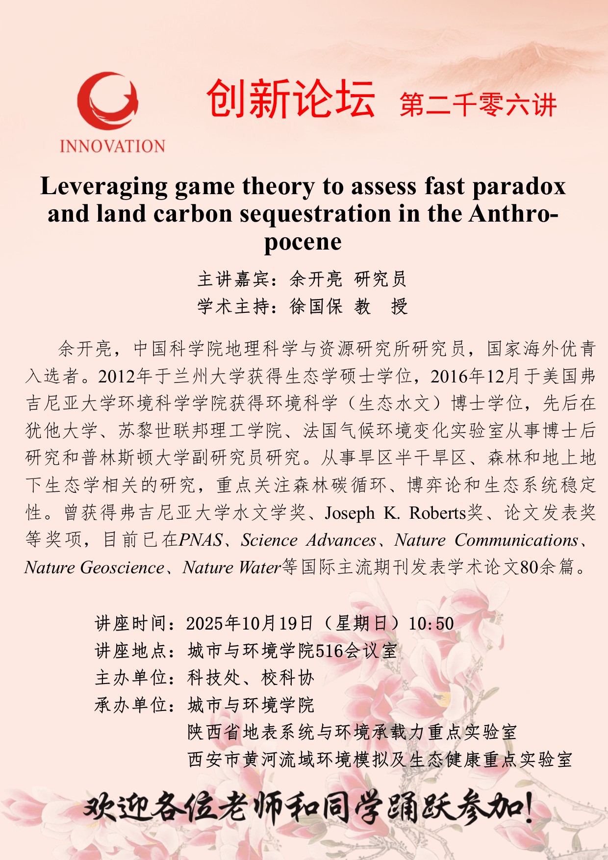 余开亮 研究员 MILAN.COM创新论坛第二千零六讲:Leveraging game theory to assess fast paradoxand land carbon sequestration in the Anthro-pocene 讲座时间 2025年10月19日(星期日)10:50 讲座地点 城市与环境学院516会议室 讲座人介绍 余开亮 研究员 讲座内容
