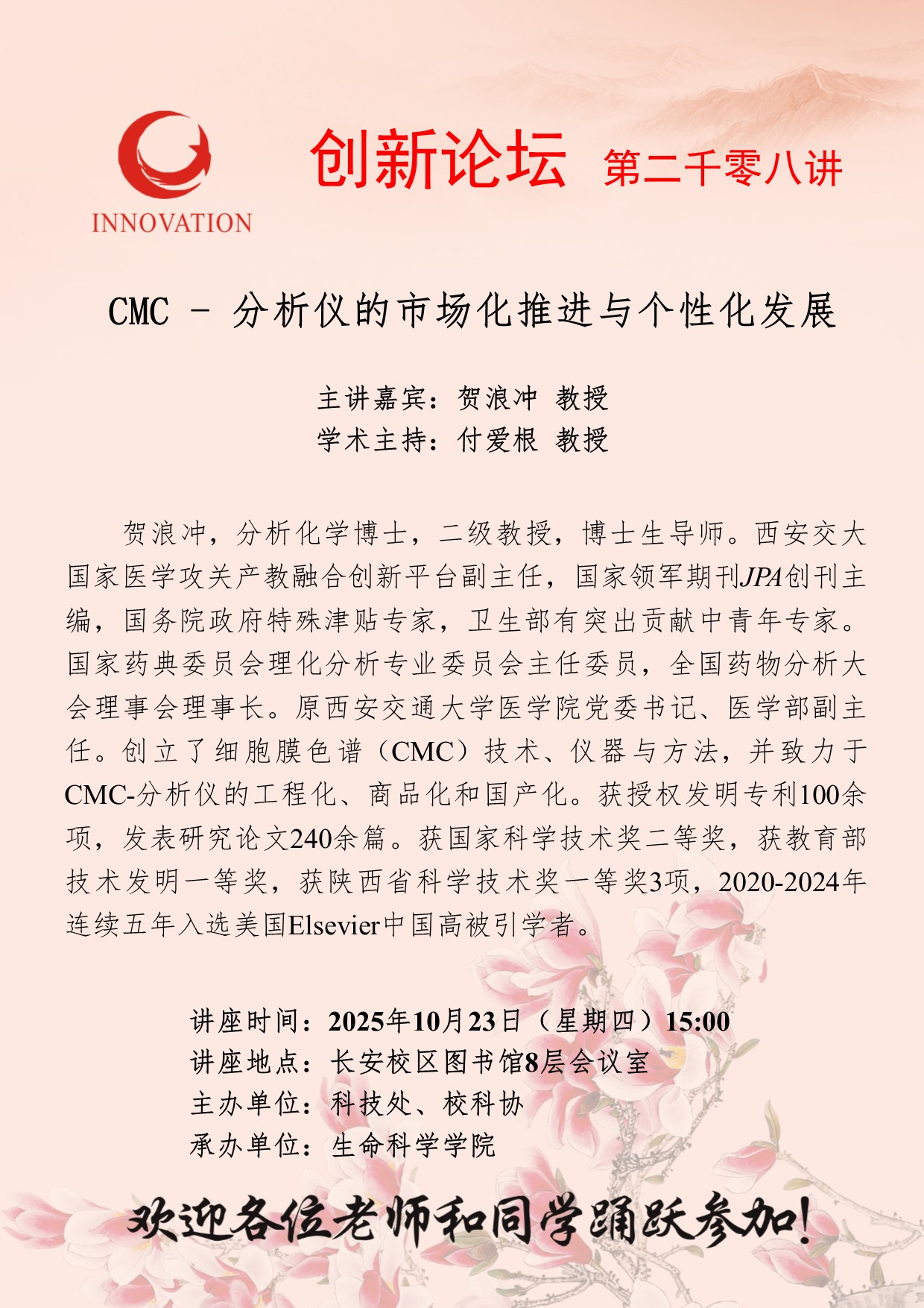 贺浪冲 教授 MILAN.COM创新论坛第二千零八讲:CMC - 分析仪的市场化推进与个性化发展 讲座时间 2025年10月23日(星期四)15:00 讲座地点 讲座地点:长安校区图书馆8层会议室 讲座人介绍 贺浪冲 教授 讲座内容