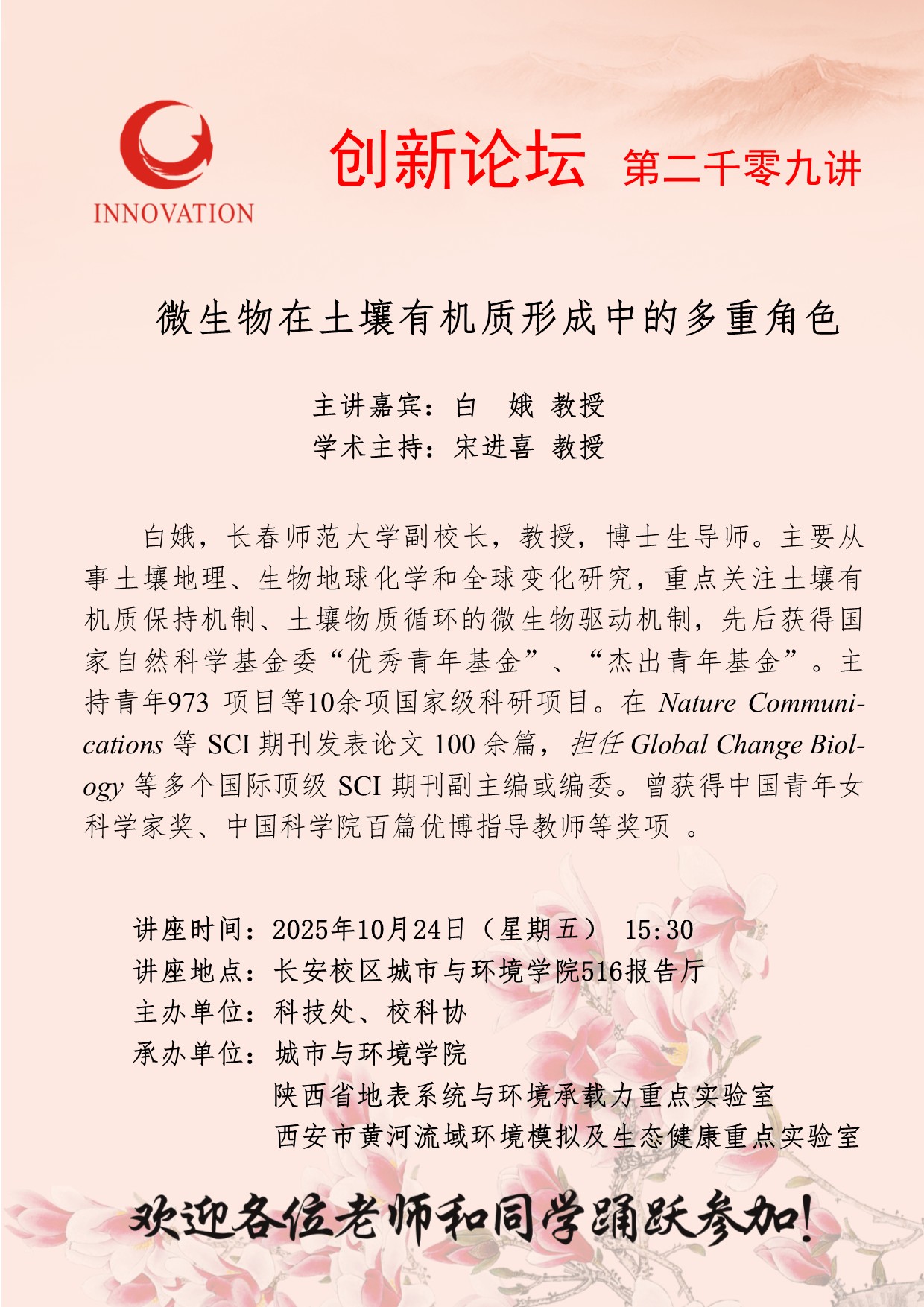 白娥 教授 MILAN.COM创新论坛第二千零九讲:微生物在土壤有机质形成中的多重角色 讲座时间 2025年10月24日(星期五) 15:30 讲座地点 长安校区城市与环境学院516报告厅 讲座人介绍 白娥 教授 讲座内容