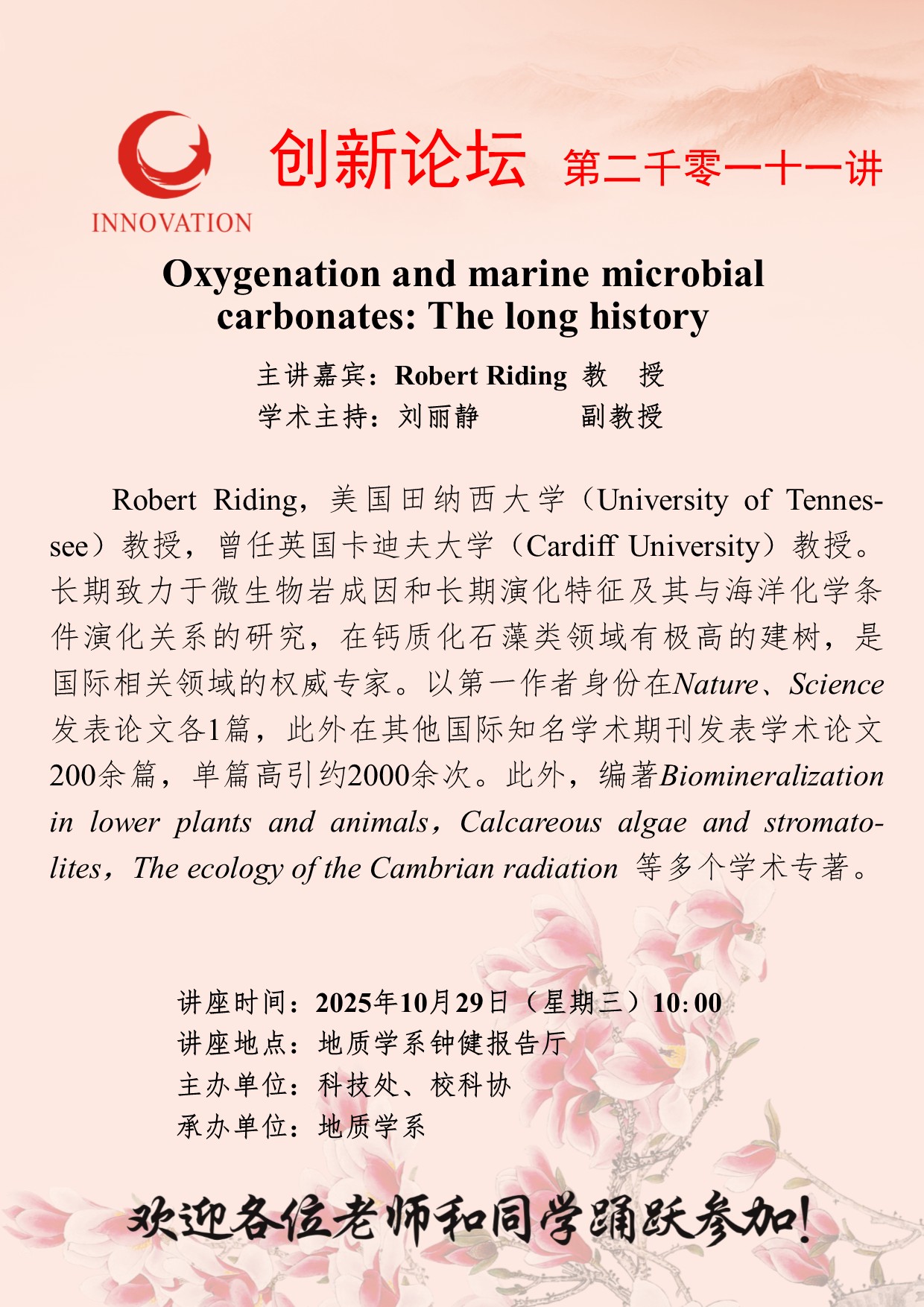 Robert Riding 教授 MILAN.COM创新论坛第二千零一十一讲:Oxygenation and marine microbial carbonates: The long history 讲座时间 2025年10月29日(星期三)10:00 讲座地点 地质学系钟健报告厅 讲座人介绍 Robert Riding 教授 讲座内容