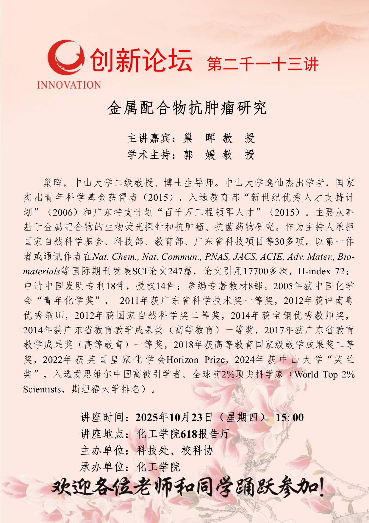 巢 晖 教 授 MILAN.COM创新论坛第二千一十三讲:金属配合物抗肿瘤研究 讲座时间 2025年10月23日(星期四) 15: 00 讲座地点 化工学院618报告厅 讲座人介绍 巢 晖 教 授 讲座内容