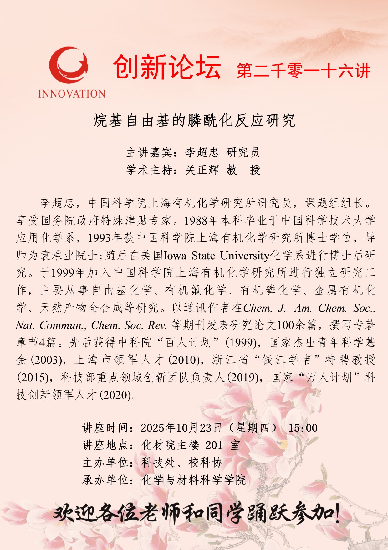 李超忠 研究员 MILAN.COM创新论坛第二千零一十六讲:烷基自由基的膦酰化反应研究 讲座时间 2025年10月23日(星期四) 15:00 讲座地点 化材院主楼 201 室 讲座人介绍 李超忠 研究员 讲座内容