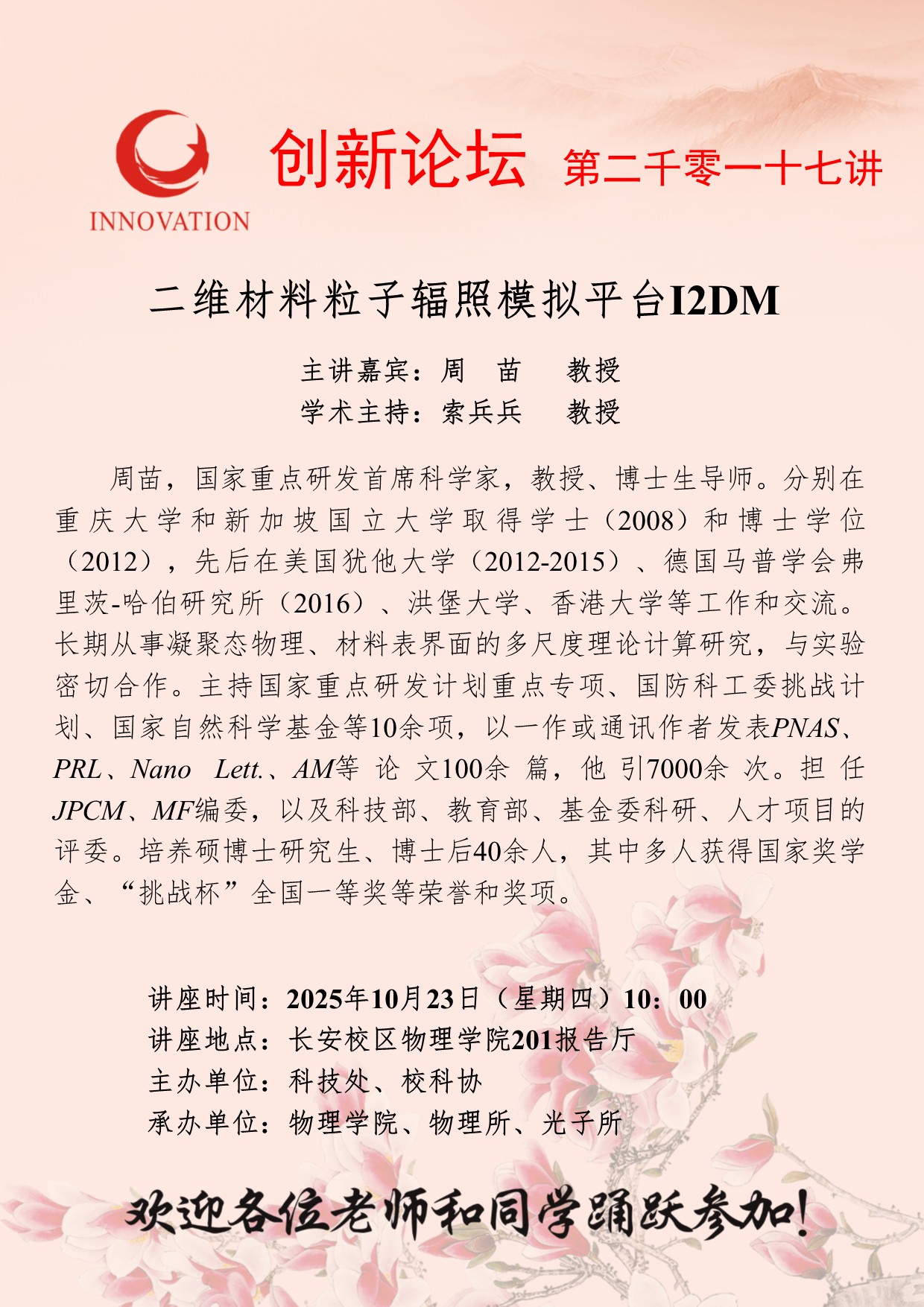 周苗 教授 MILAN.COM创新论坛第二千零一十七讲:二维材料粒子辐照模拟平台I2DM 讲座时间 2025年10月23日(星期四)10:00 讲座地点 长安校区物理学院201报告厅 讲座人介绍 周苗 教授 讲座内容